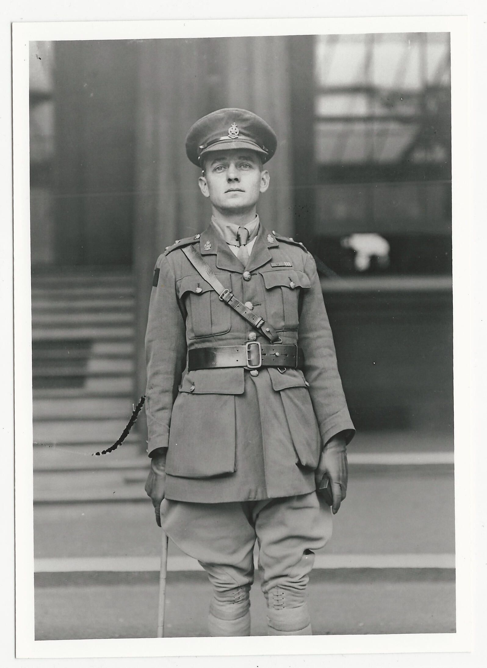 A black and white portrait of Lieutenant George B. McKean V.C. of the 14th Battalion (R.M.R) standing in his uniform in the inner courtyard of Buckingham Palace after receiving his Victoria Cross from H.M. The King.Photograph Details