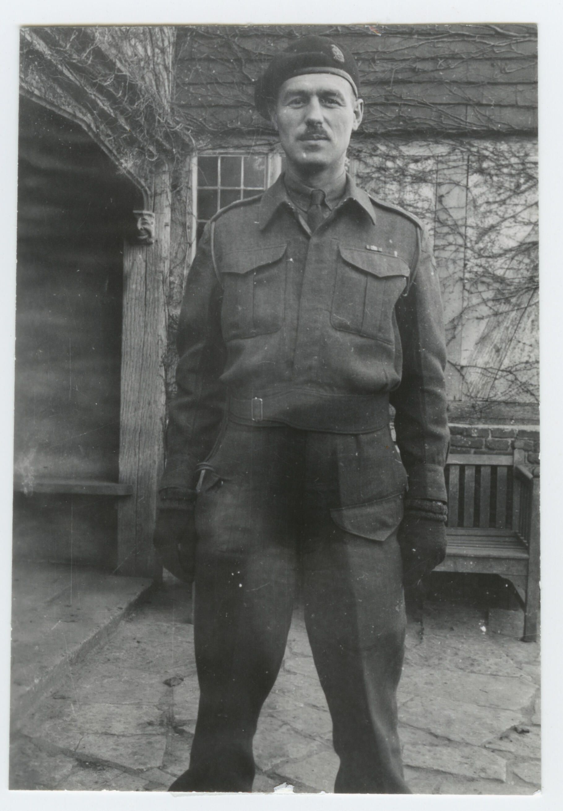 A black and white photo of Lieutenant J.M.G. Rolph in battledress uniform wearing the black beret of the Armoured Corps.Photograph Details