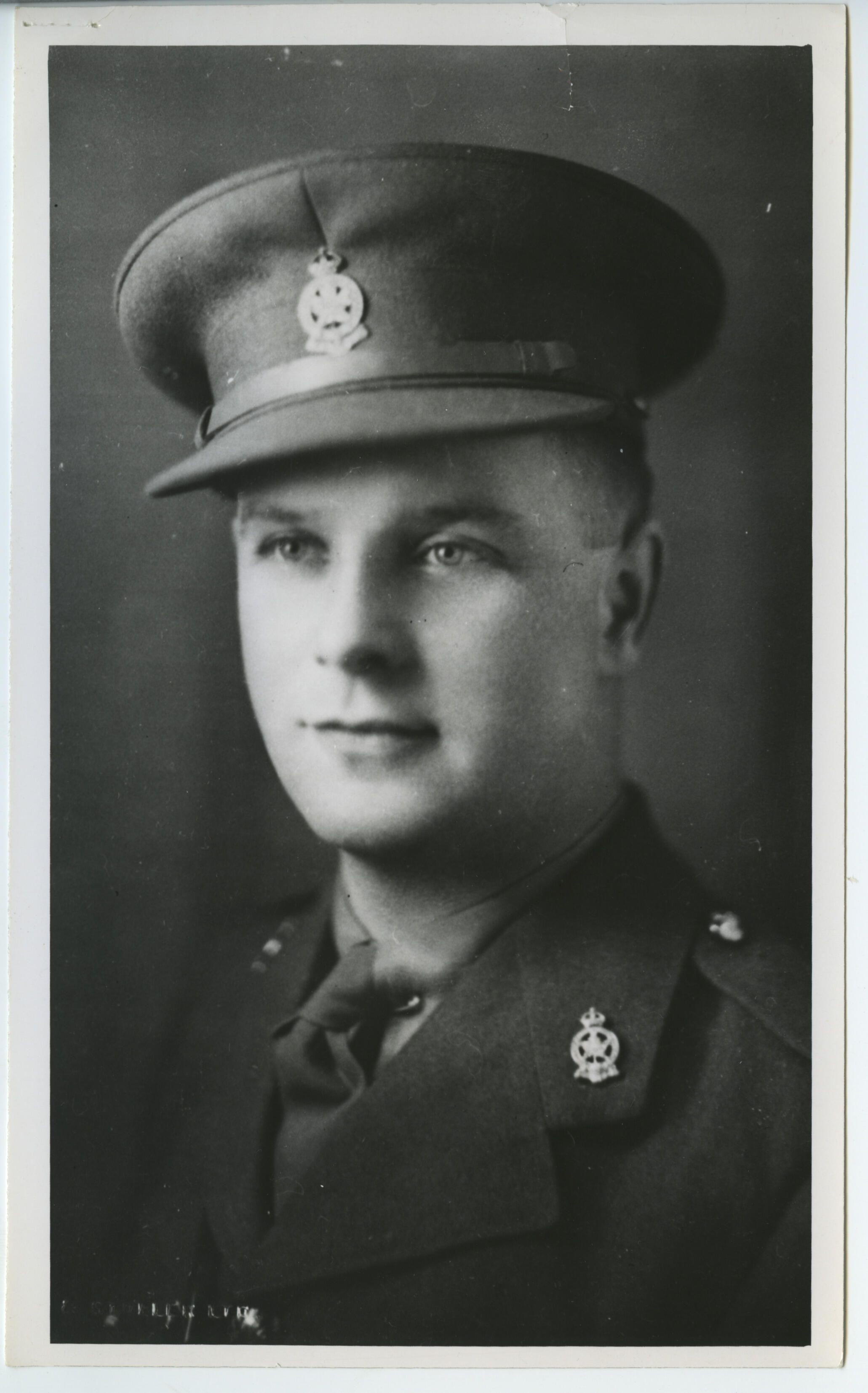 A black and white photo of Lieutenant Jack Mulcair. Lieutenant Mulcair was wounded in action while on loan to the British Army from the RMR. A newspaper clipping is glued on the verso reporting that he was wounded in France.Photograph Details