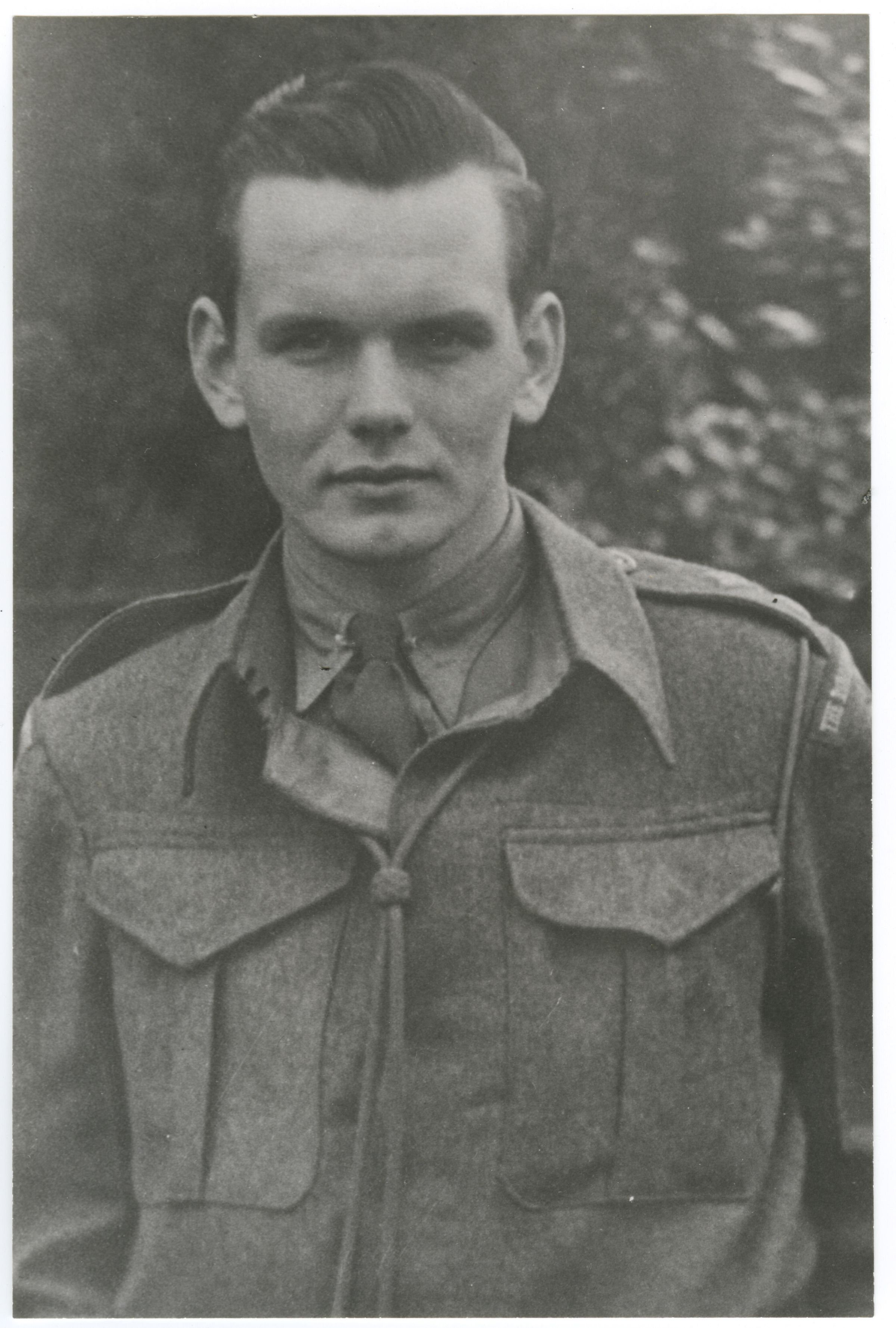 A black and white photo of Lieutenant Kenneth A. Mackenzie of the 1st Battalion, RMR. He is wearing a battledress uniform.Photograph Details