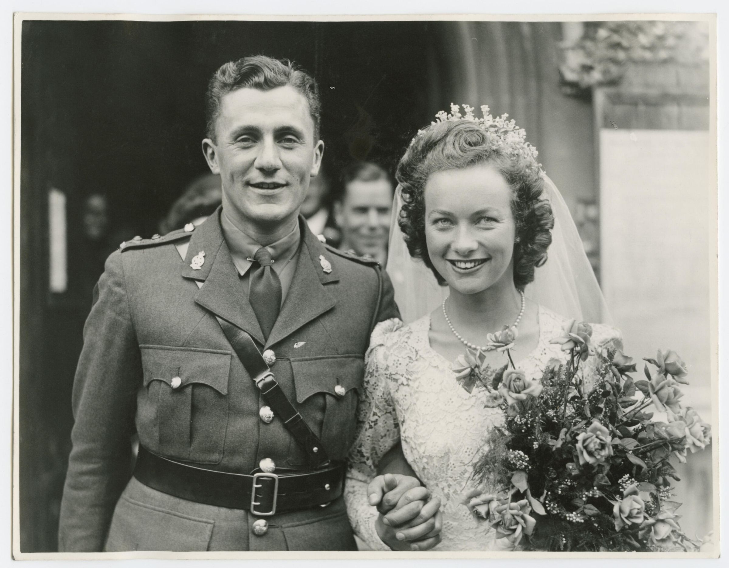 A portrait of Lieutenant Peter Patrick Mustard and his new bride, Margaret, as they step out of Church. She is wearing a white dress and holding a bouquet of flowers; he is wearing his uniform.Photograph Details