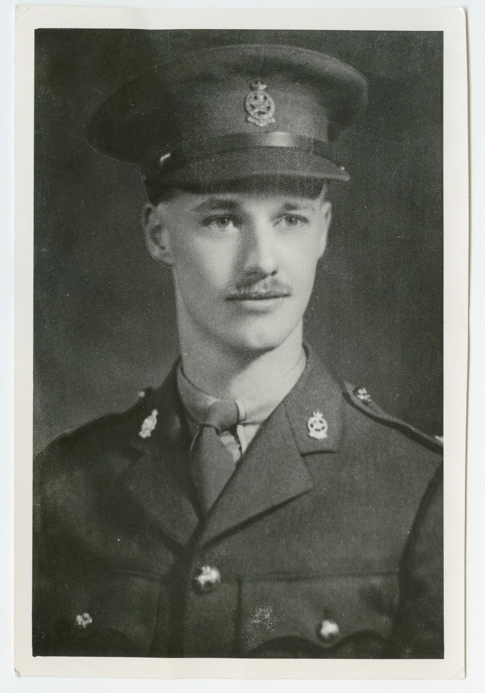 A black and white photo of Lieutenant Robert Schwob wearing his service dress uniform and his forage cap.Photograph Details