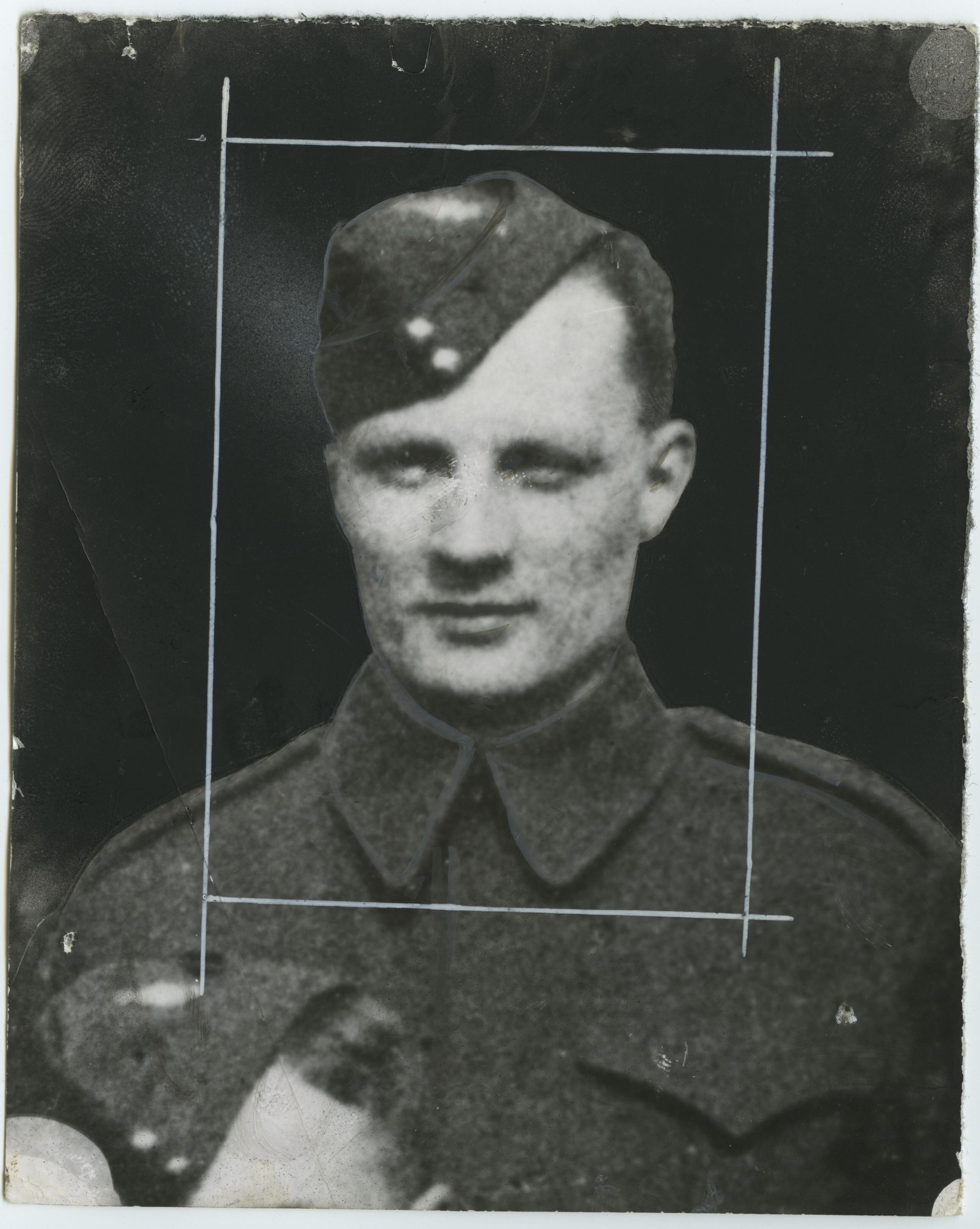 A black and white photo of former Sergeant, now Lieutenant Sam Stone who was commissioned in August 1944. The picture was modified for publication.Photograph Details