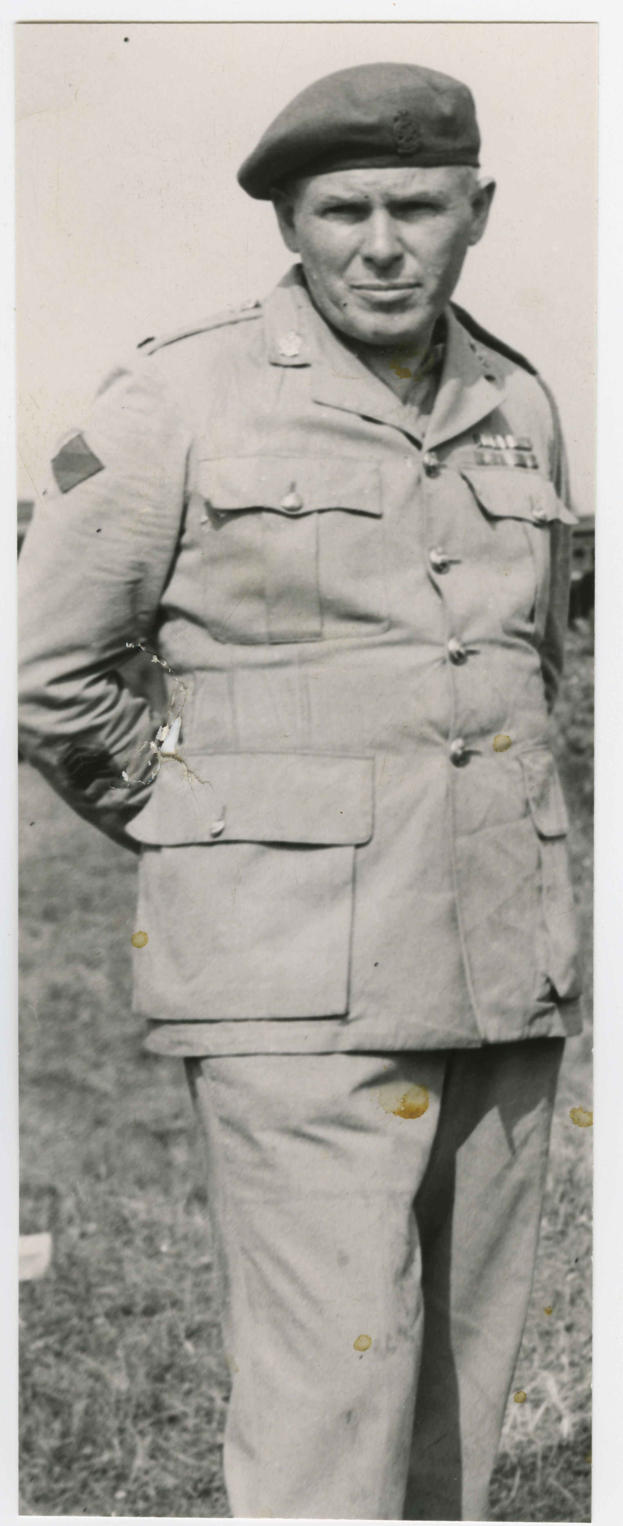 A black and white photo of Major Donald MacRae. He is wearing a Summer service dress uniform, the formation patch of the 1st Canadian Army Headquarters and what appears to be a khaki beret.Photograph Details