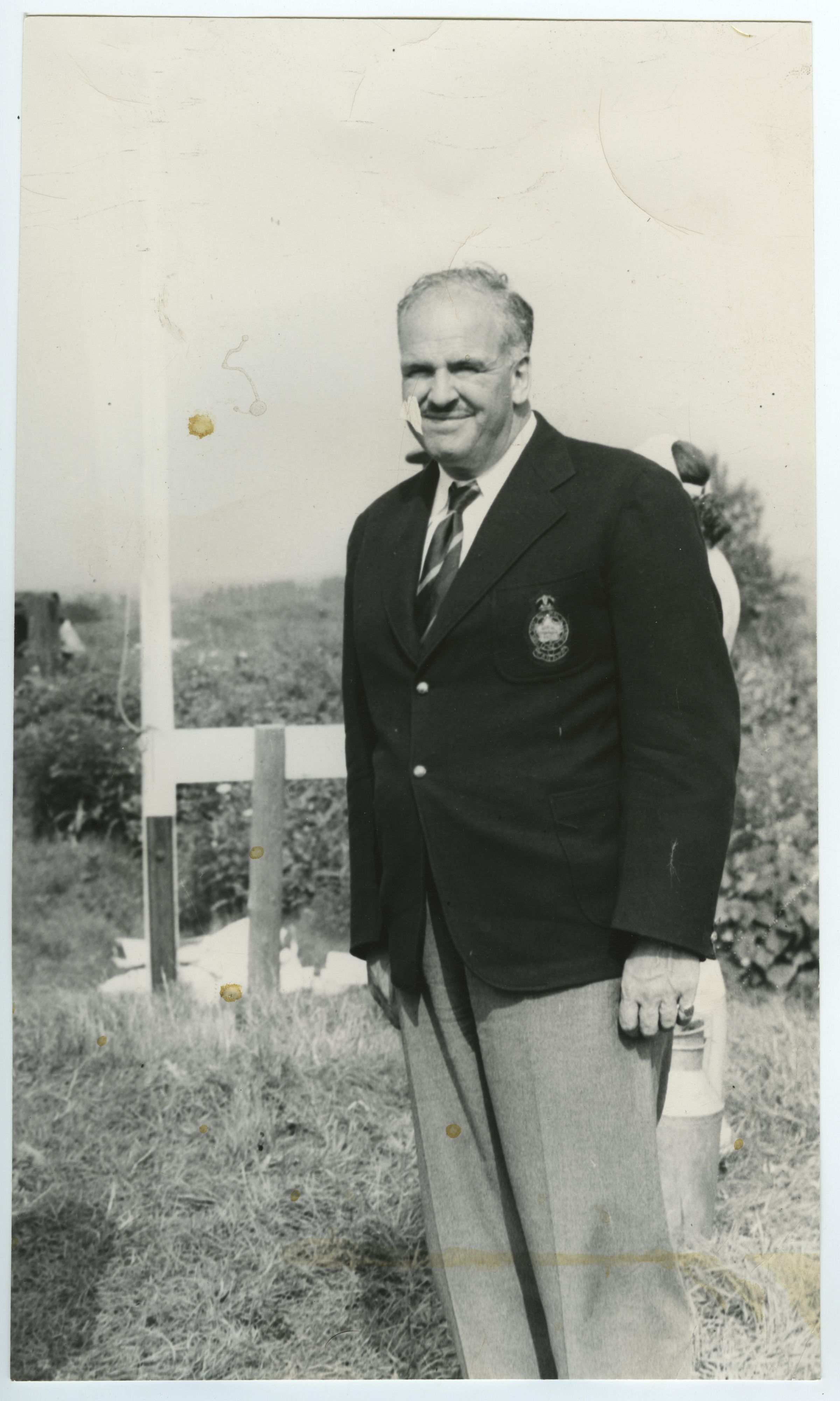 A black and white photo of Major General C. Basil Price wearing his regimental blazer and tie.