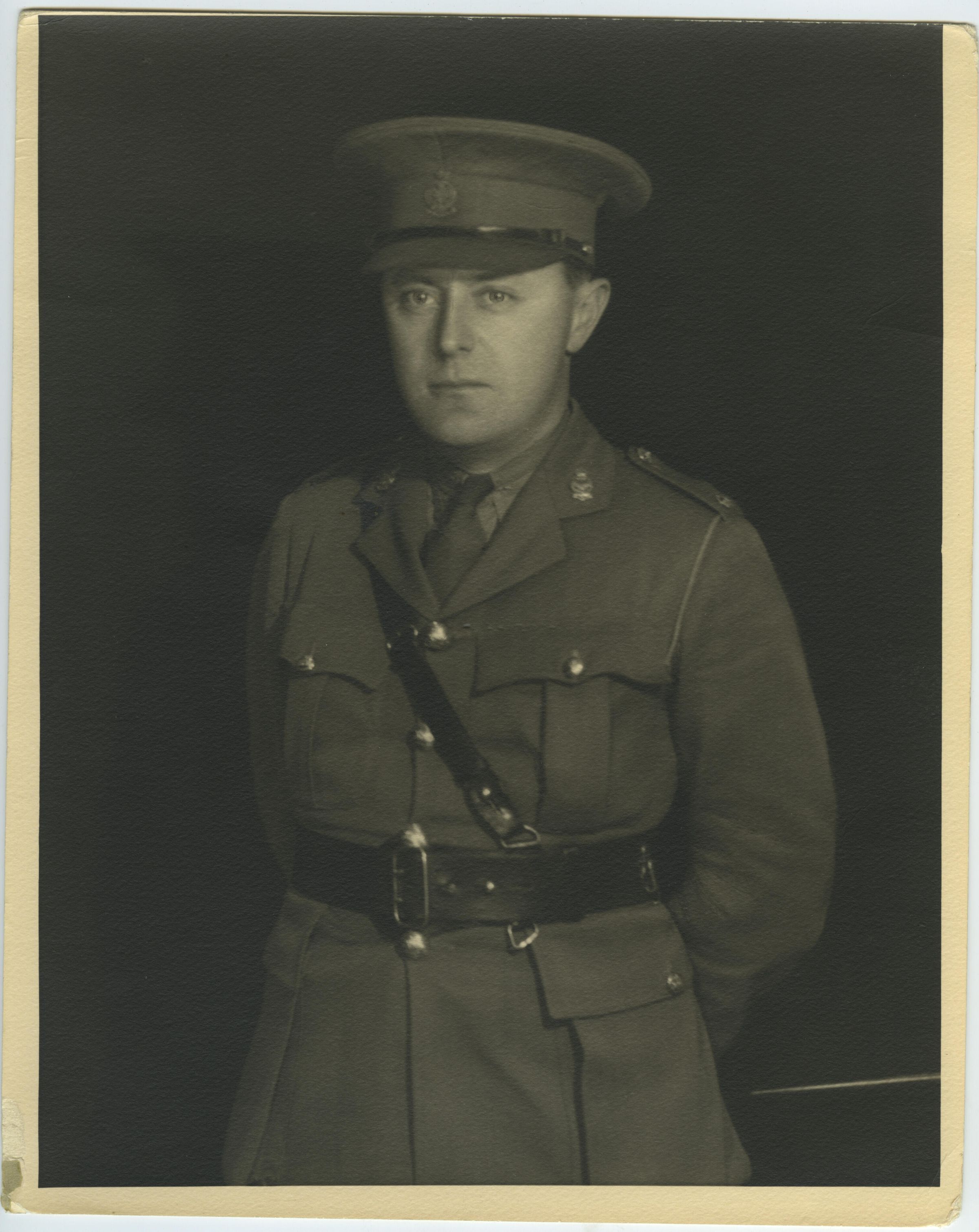 A black and white photo of Major John H. McBride from the 1st Battalion RMR. He is dressed in his service dress with a Sam Browne belt and a forage cap.Photograph Details