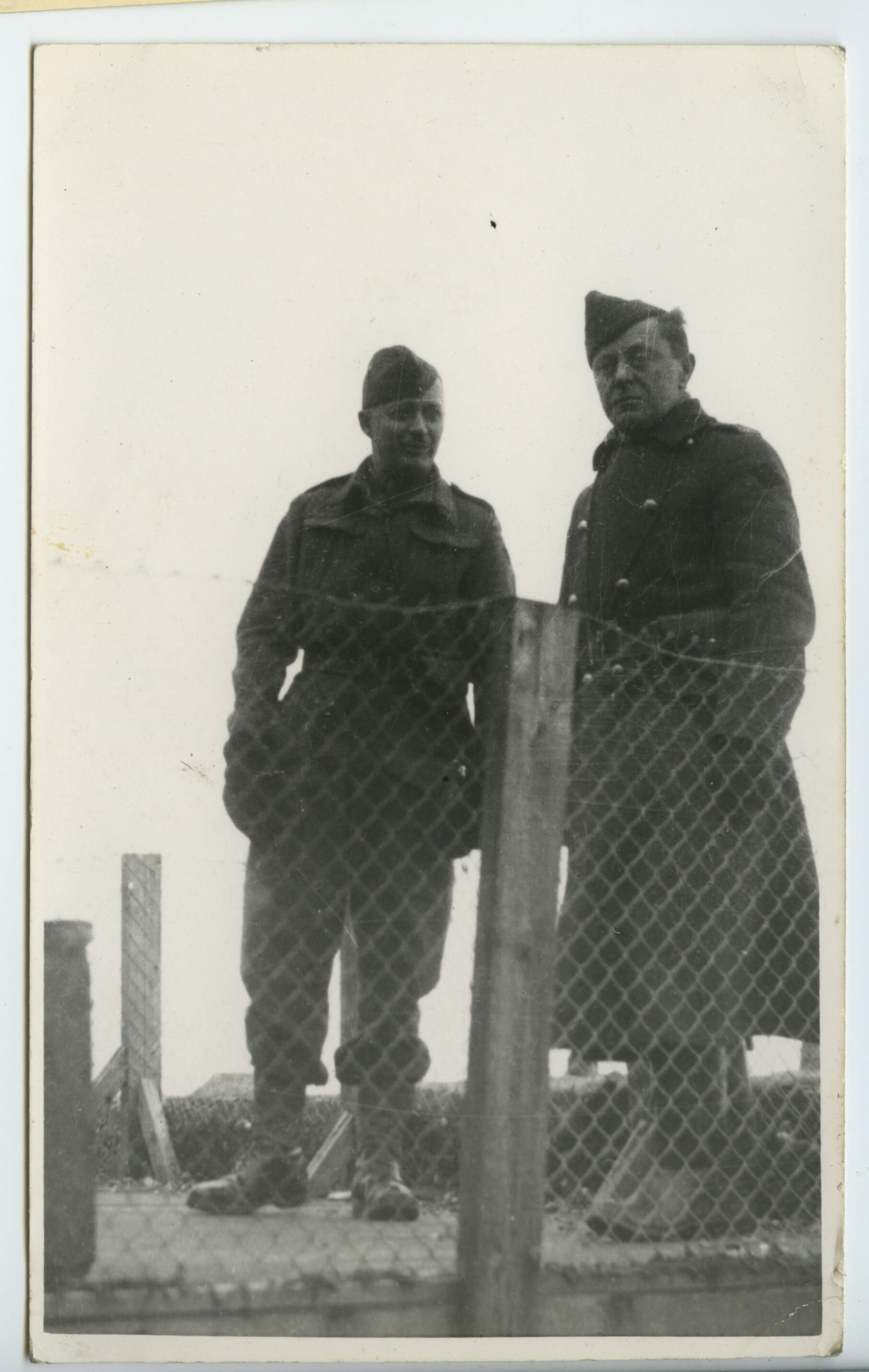 Major Paul H. Barre and Major John H. McBride dressed in battledress uniforms. They are wearing the early war wedge caps and carrying sidearms, probably pistols.Photograph Details