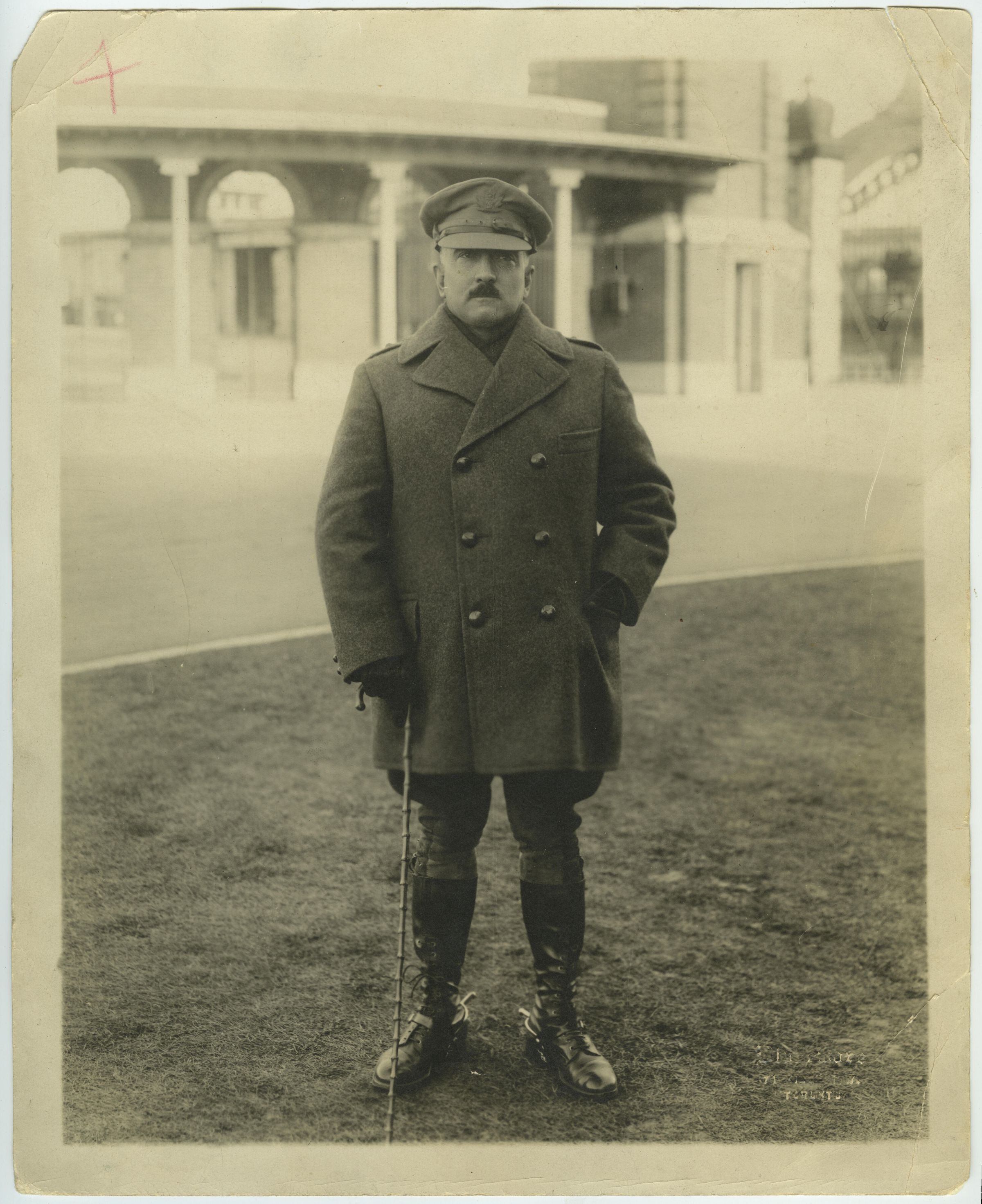 An officer wearing a 'British Warm Coat' over his uniform. He is holding a cane with his right hand. He is wearing gloves on both hands and riding boots with spurs, the mark of an officer of the rank of Major and above. In the background we can see a building with a portico.Made/Created