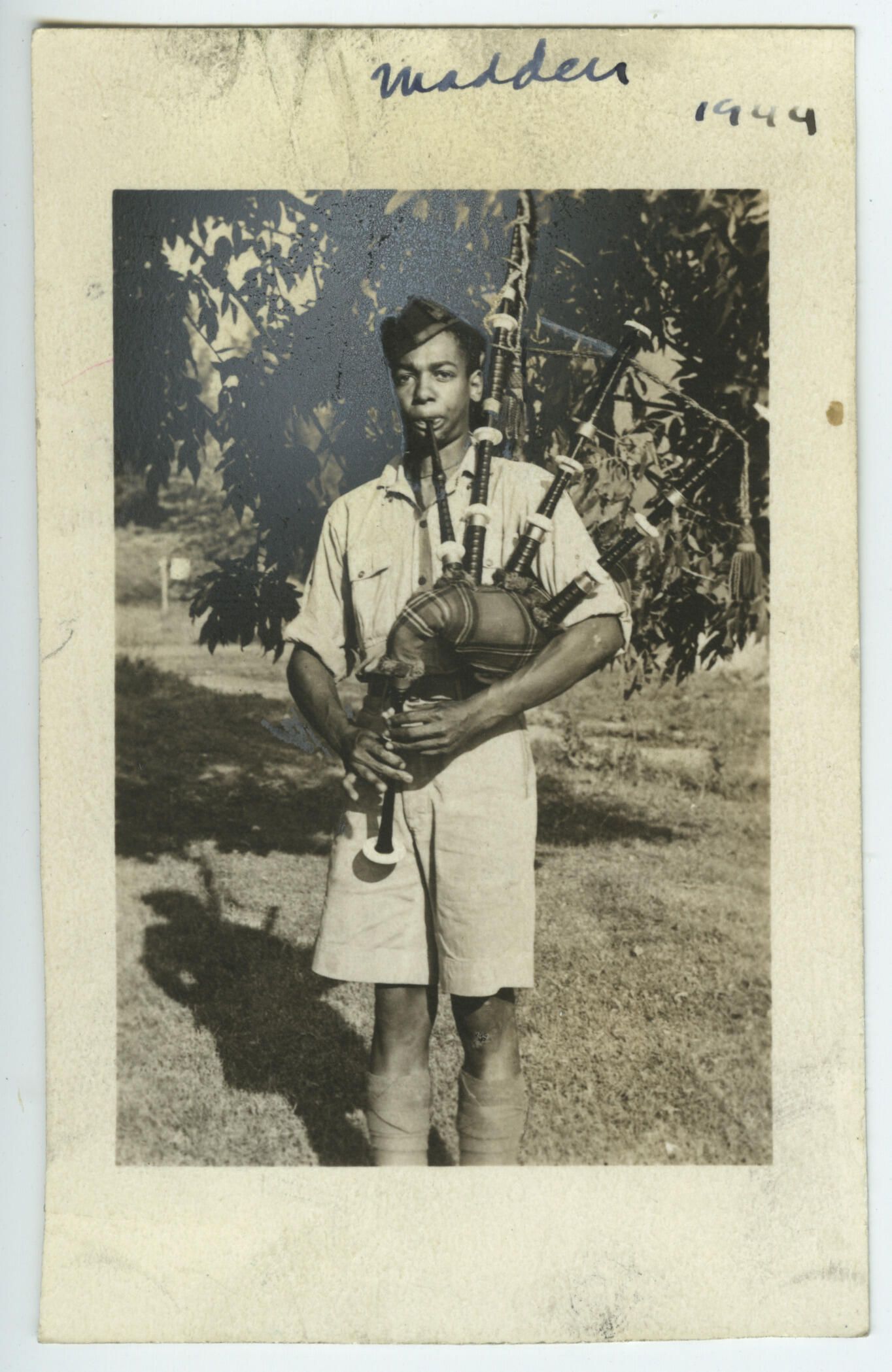 Harry Madden was a bag-piper who originally joined the Royal Montreal Regiment during World War II. He was transferred to the Royal Canadian Corps of Signals prior to 1945. In the early 1950's, he was part of the Royal Canadian Navy as an officer on the HMCS Gloucester and the HMCS Cornwallis.Photograph Details