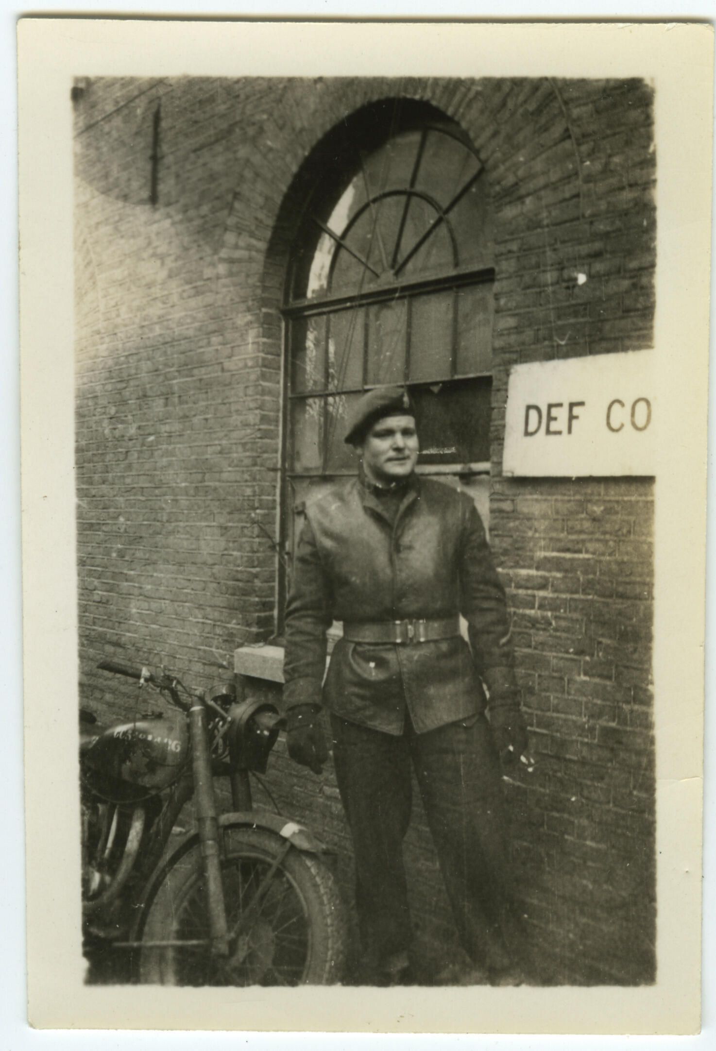 A black and white photo of Private J. R. Gagnon, the Company Cobbler, standing alongside a motorcycle preparing to go out.