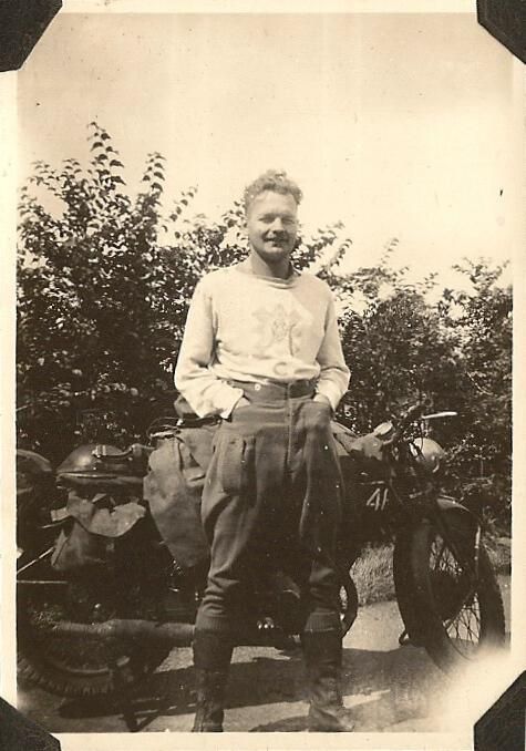 A black and white photo of Private Thomas Scovil standing in front of his Norton WD 16H motorcycle. He is wearing a sweat shirt with the badge of a Highland regiment on the front.Photograph Details