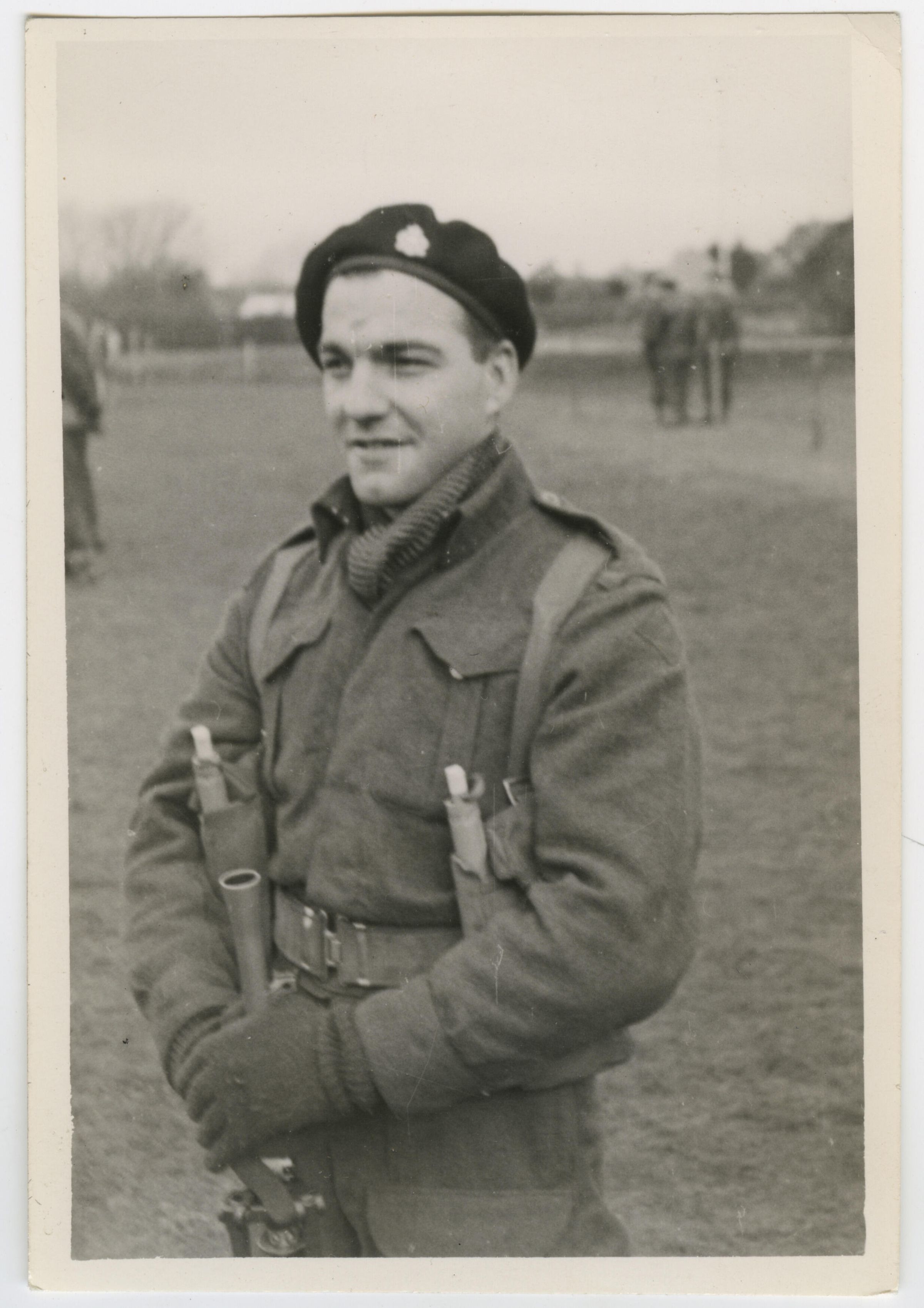 A black and white photo of Private White dressed in battledress with webbing, scarf and the black beret of the Armoured Corps. He is also wearing the formation patch of the 1st Canadian Army Headquarters. He is holding the barrel of a Bren Gun light machine gun.