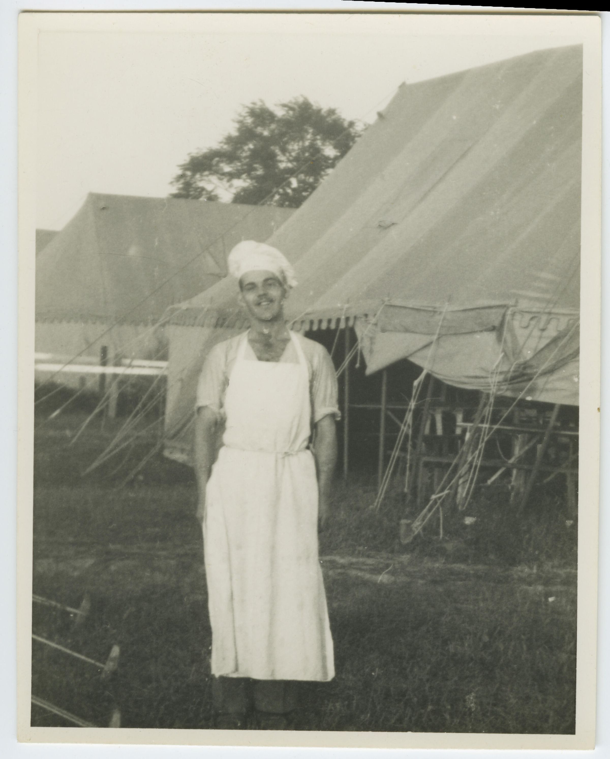 Portrait of a Regimental Cook, with a Chef's hat and apron. He is standing outside some marquee tents where tables and benches have been arranged for dining. This was a common set up on the field.