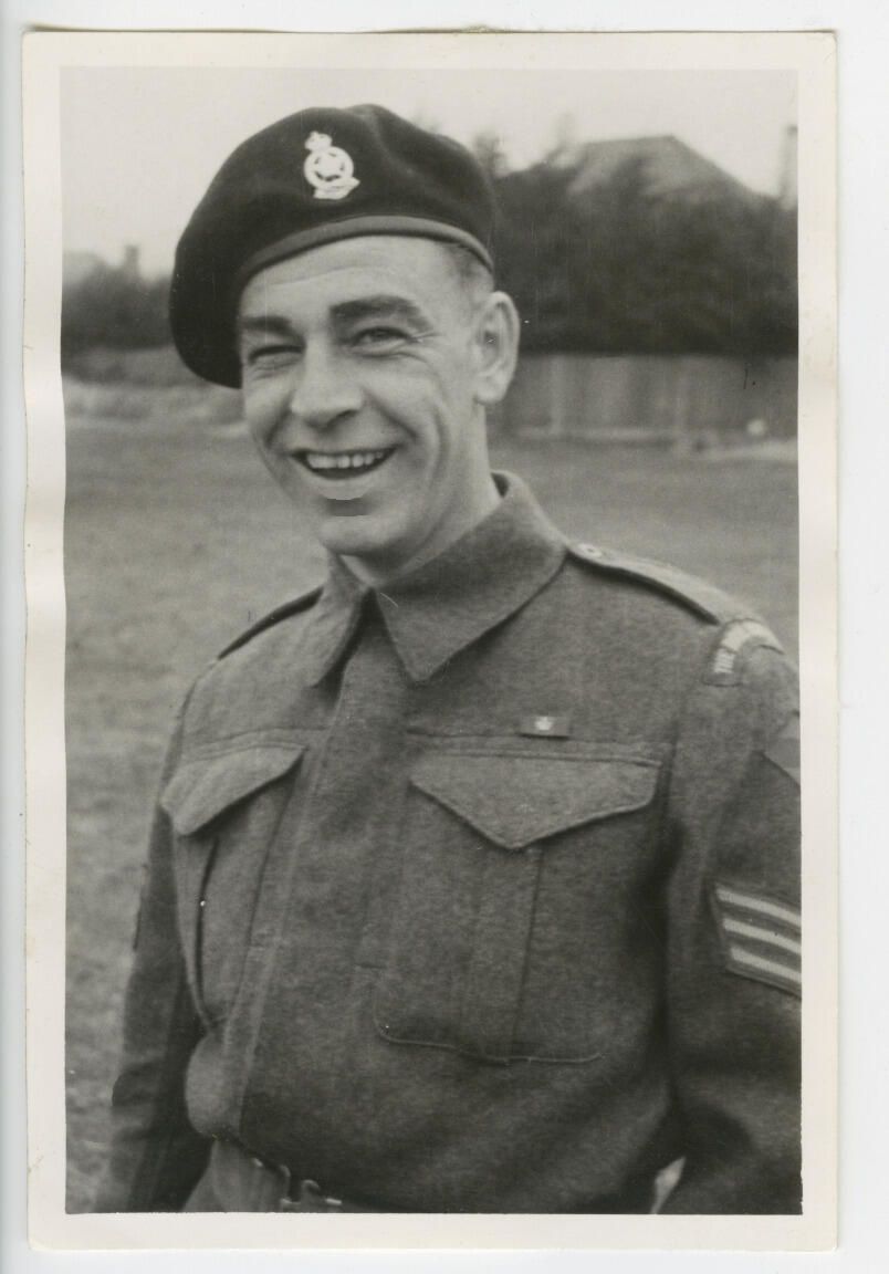 Portrait of an RMR Sergeant in uniform laughing. He is wearing the black beret of the Armoured Corps indicating he was a member of the 32nd Reconnaissance Regiment (The Royal Montreal Regiment)
