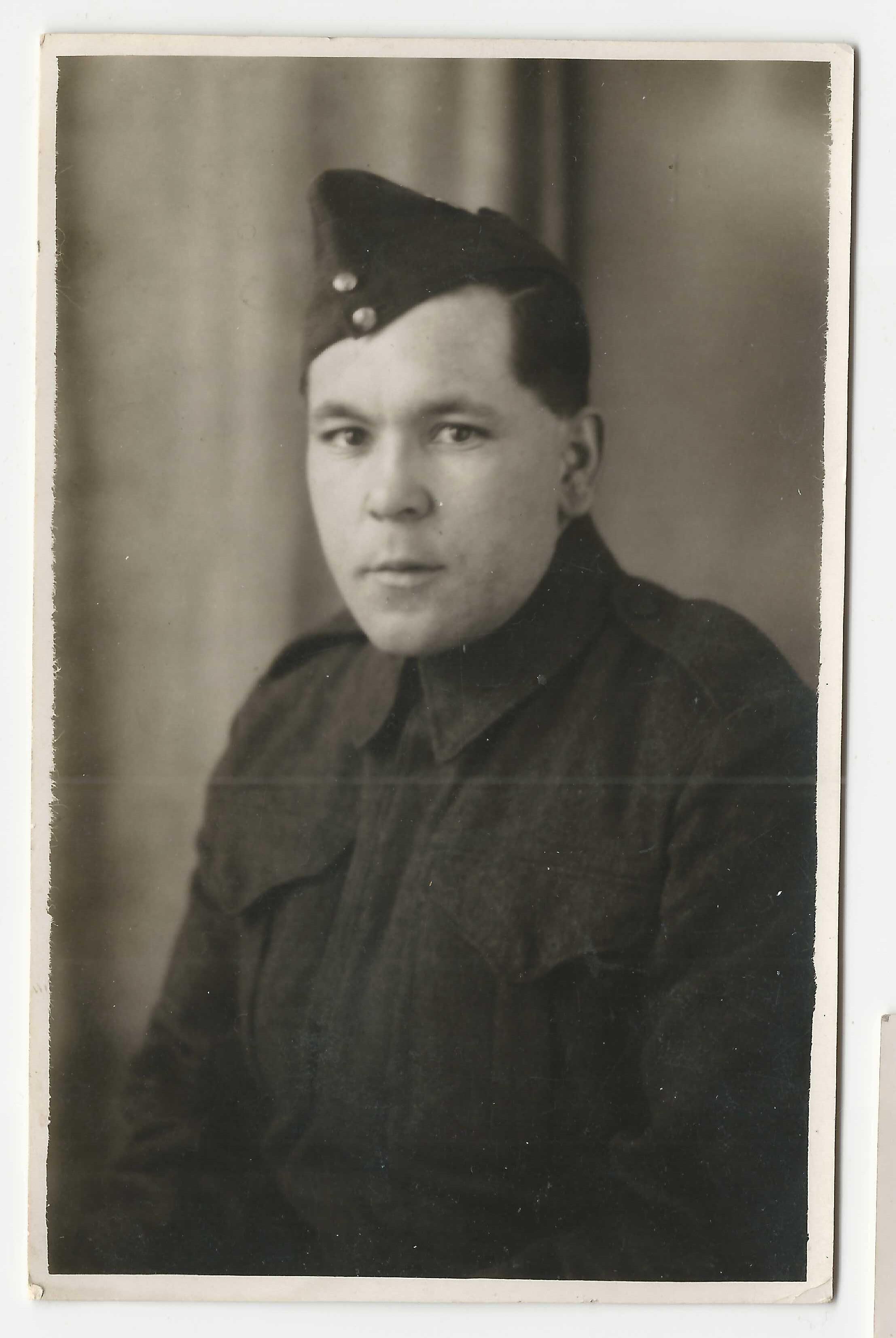 A black and white portrait photo of Private Russell J. Hodgson wearing his battledress uniform and wedge cap.Photograph Details