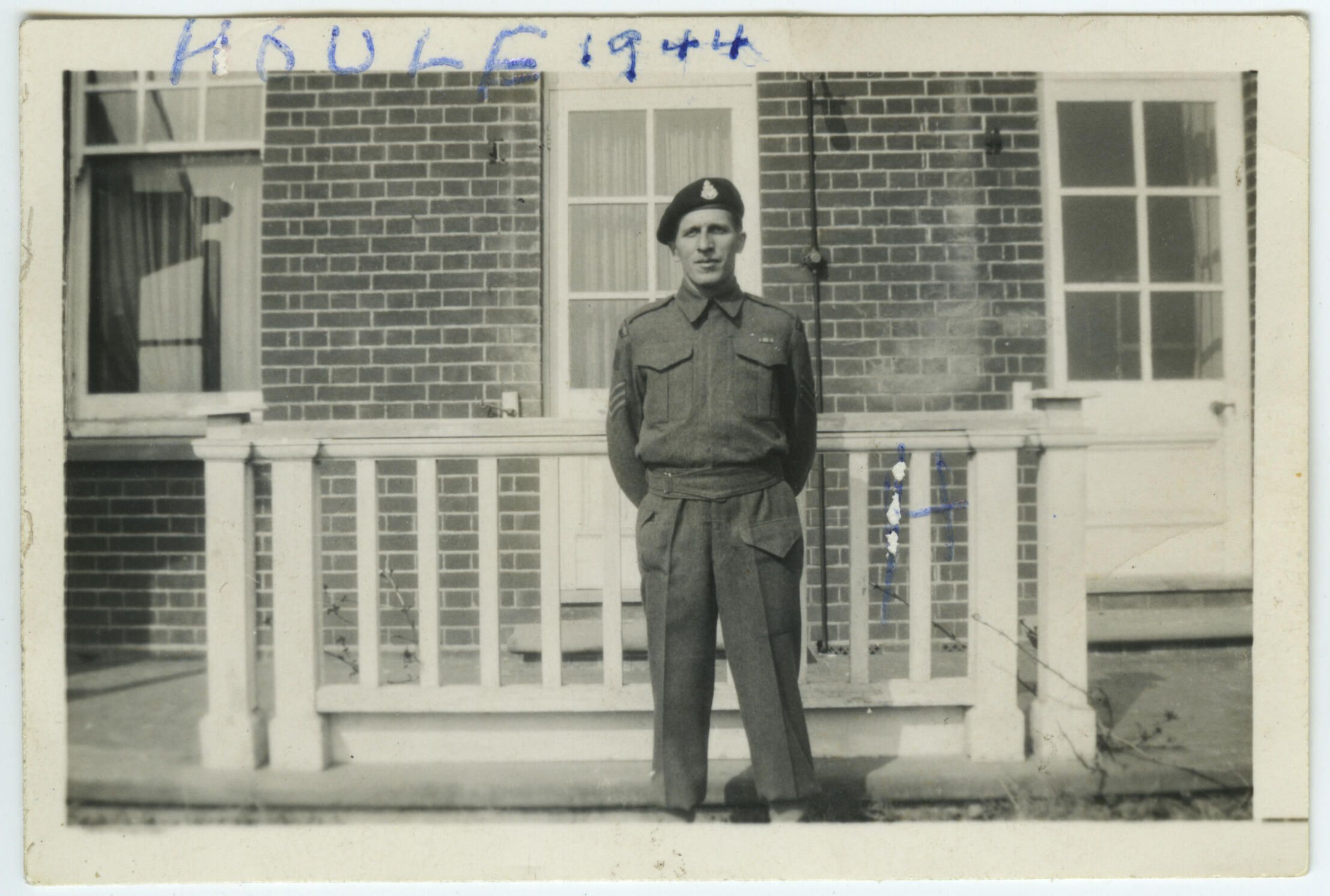 A black and white photo of Sergeant Art Houle wearing battledress uniform and the black beret of the Armoured Corps.Photograph Details