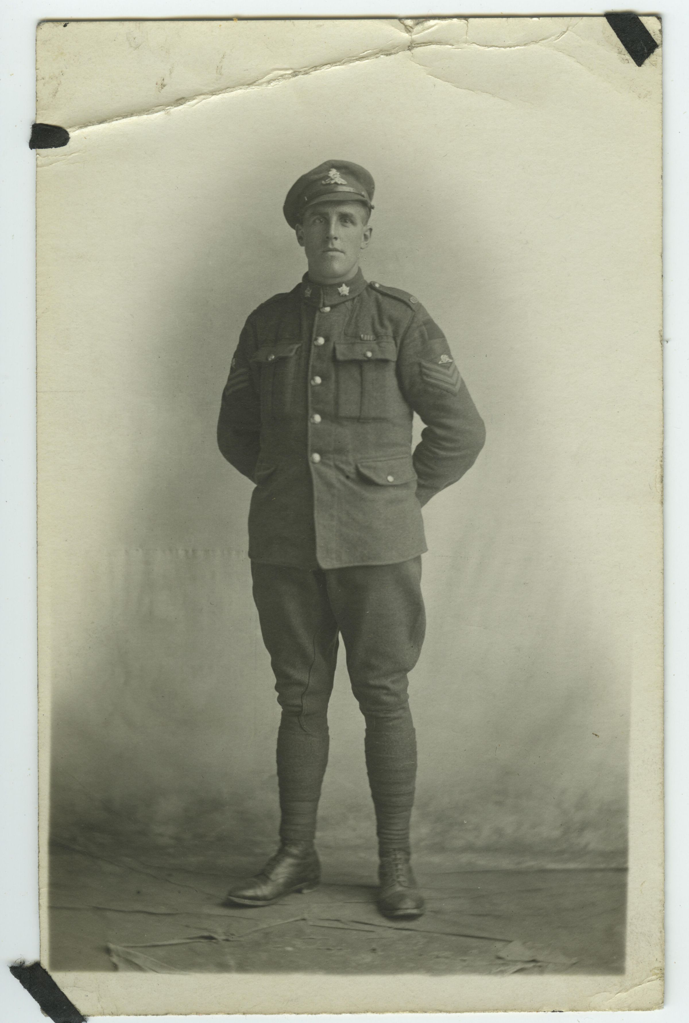 Unknown Canadian soldier standing with his hands behind his back. He is wearing uniform with Artillery cap badge and Sergeants stripes on his sleeve.Made/Created