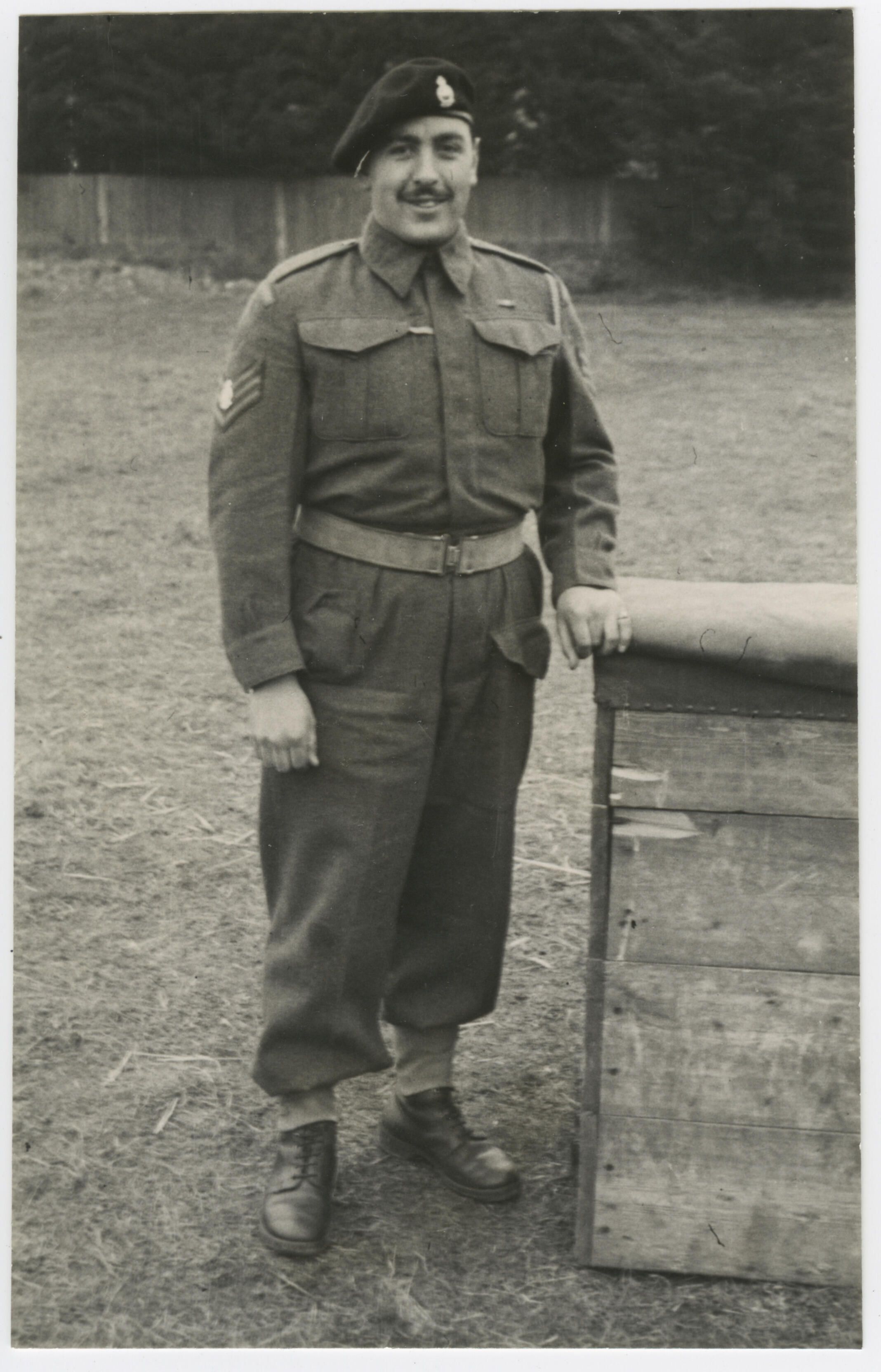 Sergeant Hayes is standing with his hand on a vaulting horse Coteau Barracks.Photograph Details