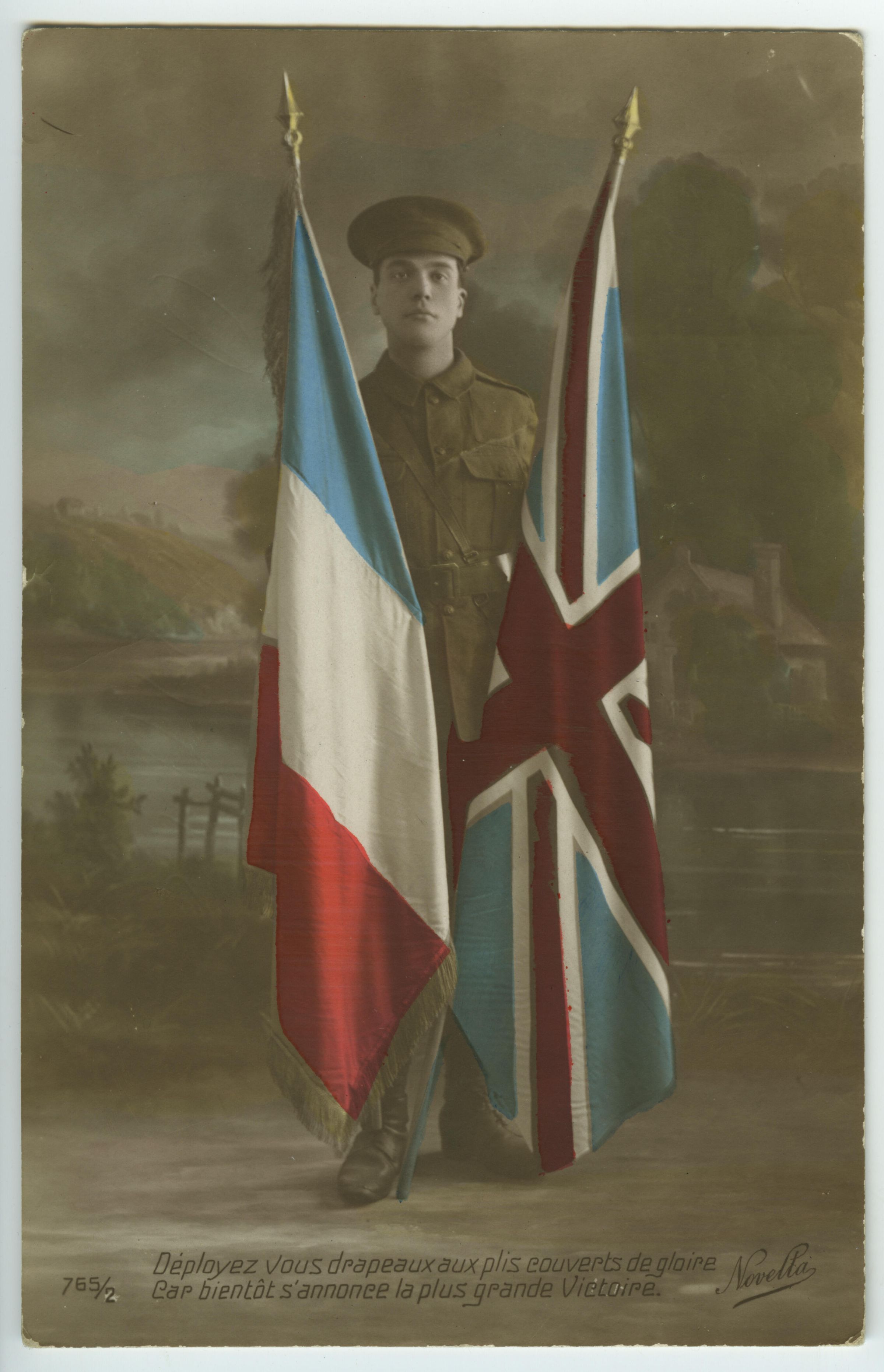 Studio portrait of a soldier in uniform standing holding the Union Jack in his left hand and the French flag in his right hand. The flags were coloured.