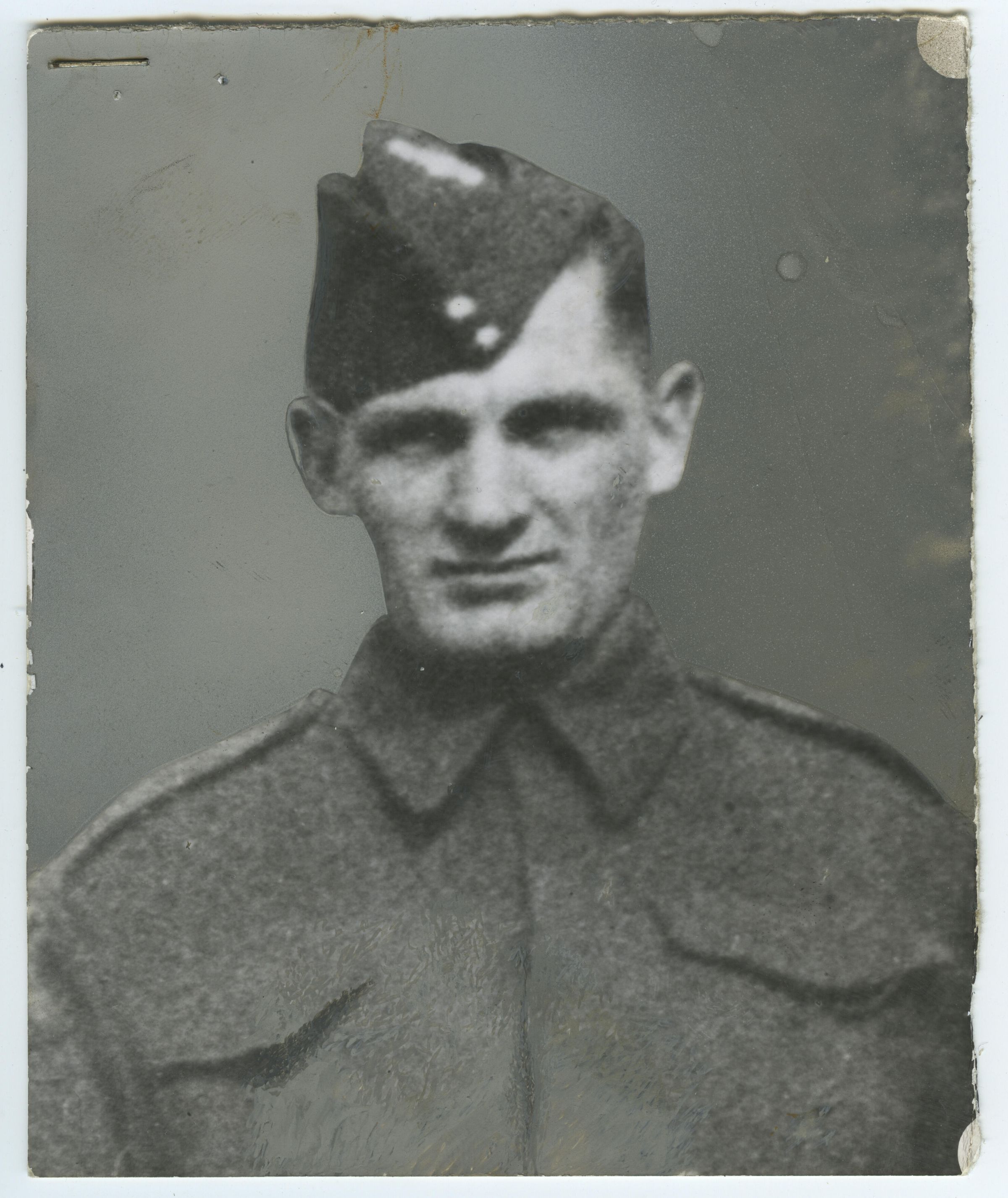A black and white portrait photograph of Squadron Sergeant Major (SSM) Colin C. White. He served with the 1st Battalion RMR, the 32nd Reconnaissance Regiment (RMR) and later with the 17th Duke of York, Royal Canadian Hussars.