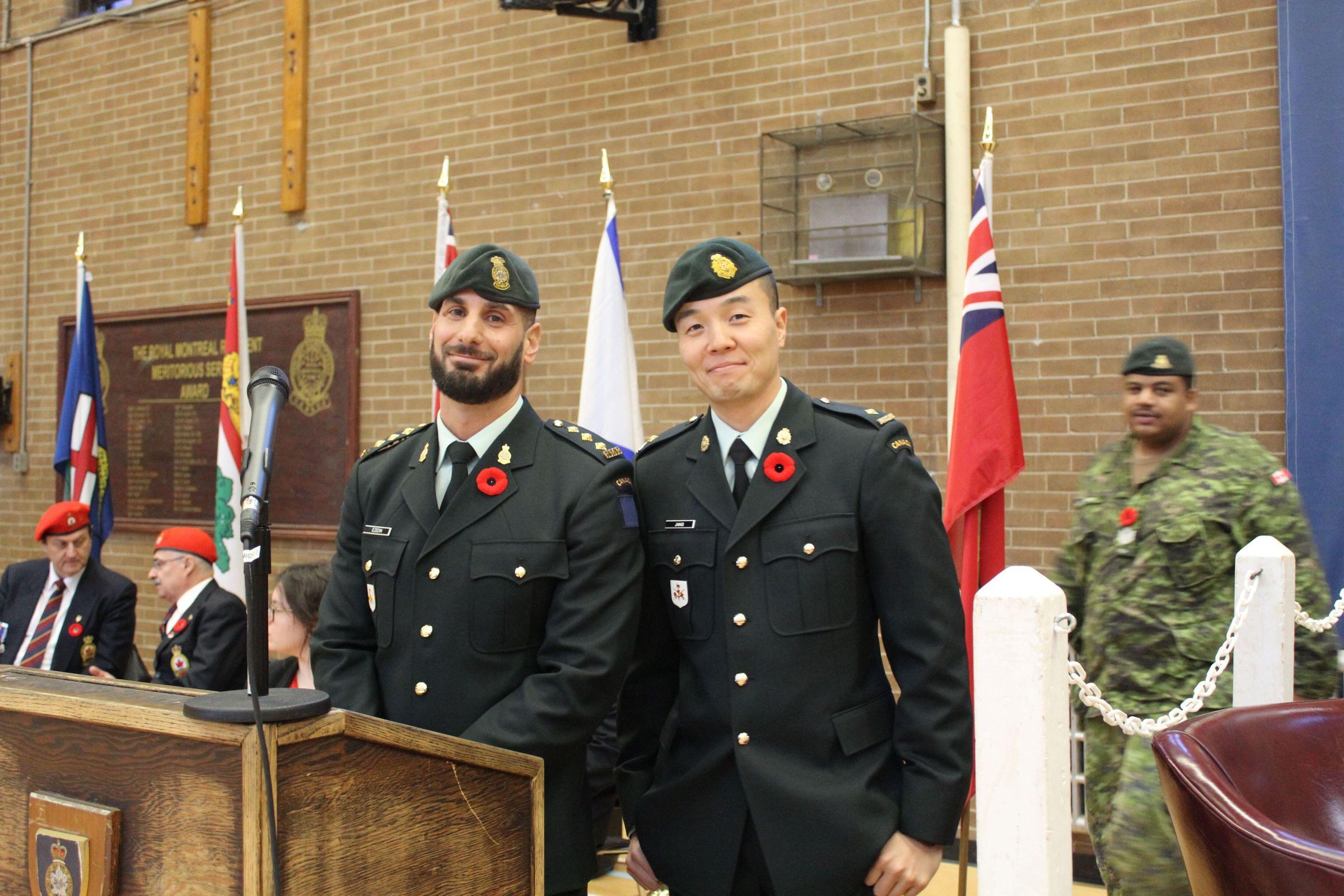 Captain Rayan Ezedin and Second Lieutenant Doosoon Jang getting ready to host the Remembrance Day review at the Westmount Armoury. In the background Sergeant Didier Dupuy is visible.Photograph Details