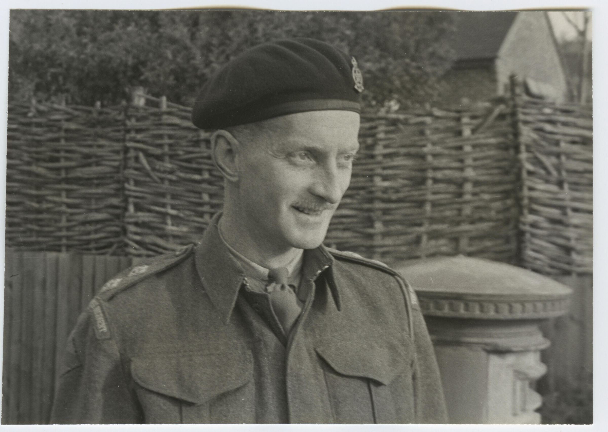 A black and white photo of an unidentified Lieutenant of The Royal Montreal Regiment. He is wearing a battledress uniform with the Formation patch of the 1st Canadian Army Headquarters and the black beret of the Armoured Corps.Photograph Details