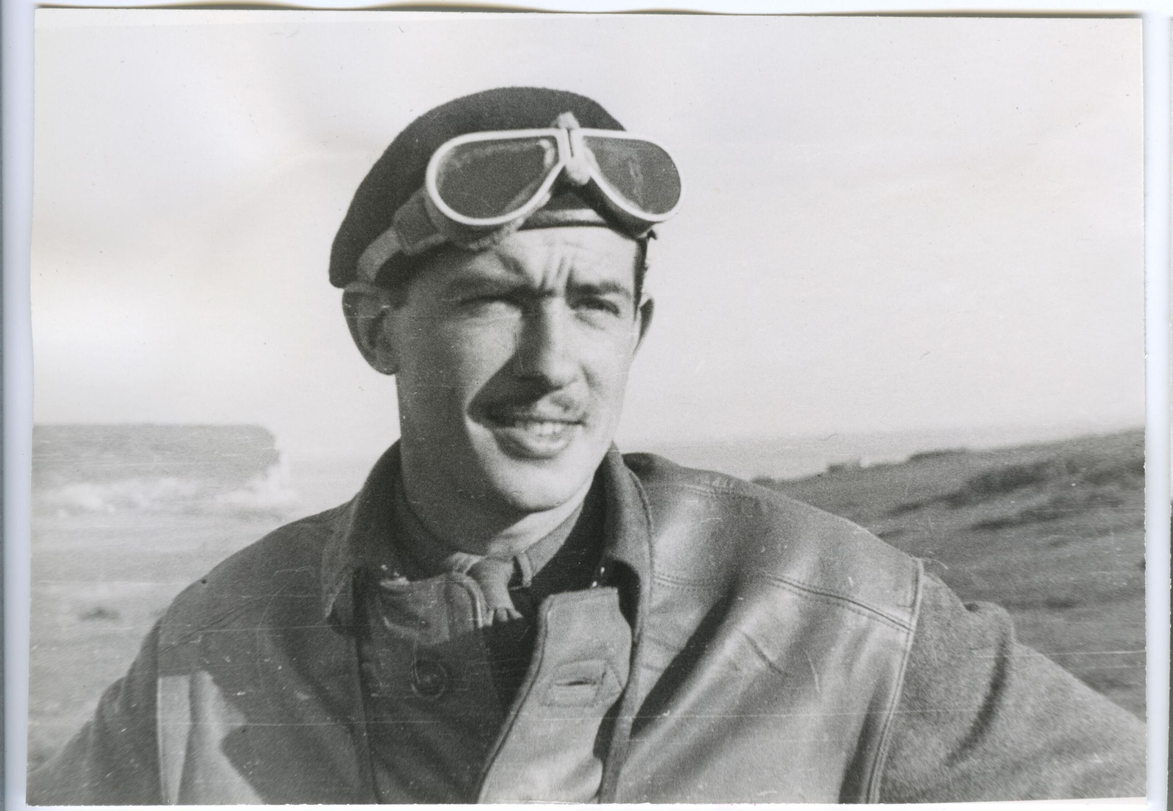 A black and white photo of an unidentified member of The Royal Montreal Regiment wearing battledress covered with a leather jerkin and the black beret of the Armoured Corps over which he has his goggles..Photograph Details