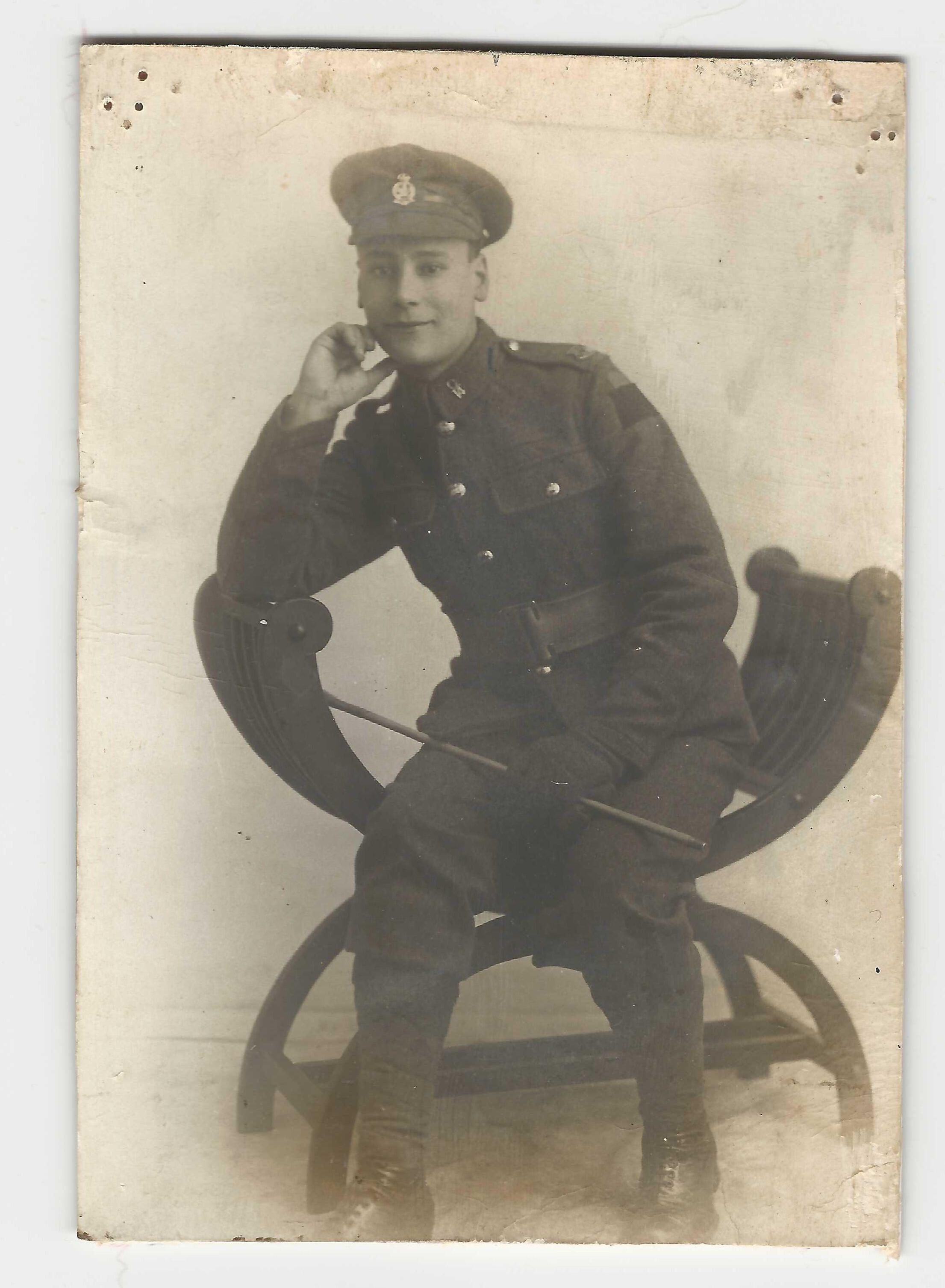 Lance Corporal William Frank Walker posing in uniform. He is sitting with his head resting on his right hand, and a swagger stick in his left hand.Photograph Details