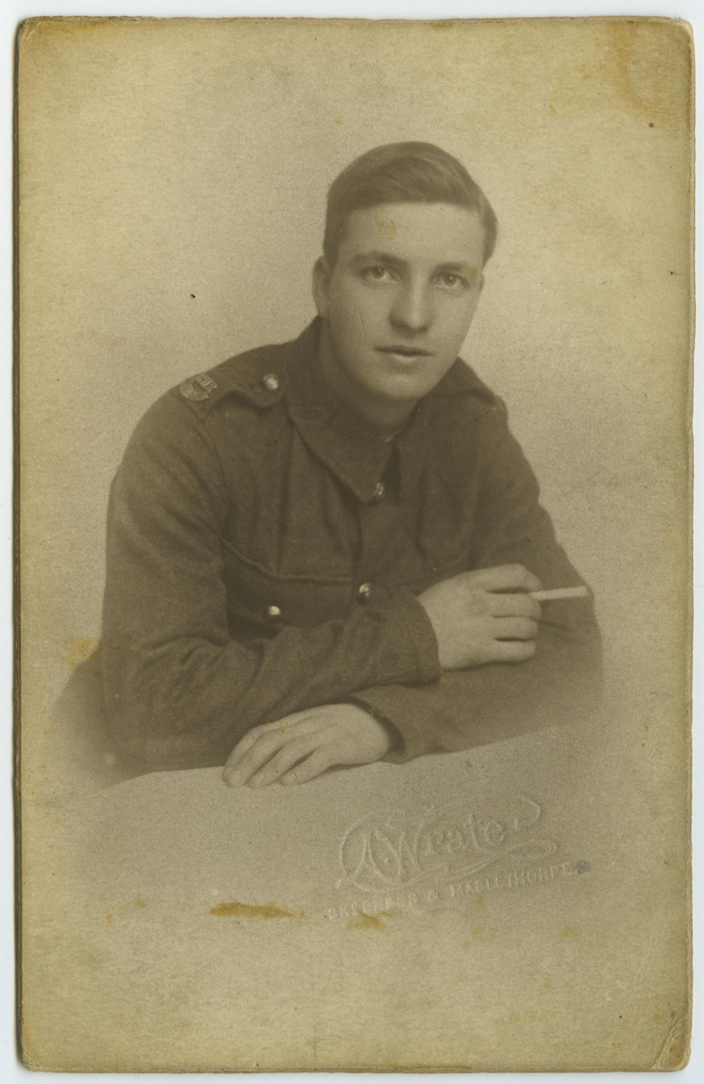A soldier in uniform sitting down and resting his arms on a table. He is holding a cigarette with his right hand. He does not wear any headdress. On his shoulder epaulets, he wears brass RMR Canada shoulder titles.Photograph Details