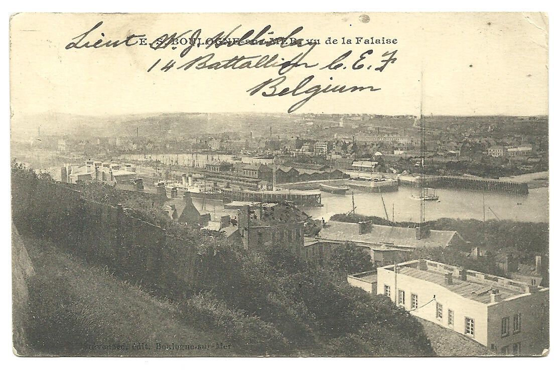 A postcard showing a view of the harbour and surrounding town of Boulogne, on which newly commissioned Lieutenant W.J. Holliday has signed his name and "14th Battalion, C.E.F., Belgium." On the verso, he has written a message to his mother in Canada saying he is now in France, having just been posted to the 14th Bn. C.E.F. He had previously been on the strength of the 23rd Battalion, C.E.F.Subject Person/Organization