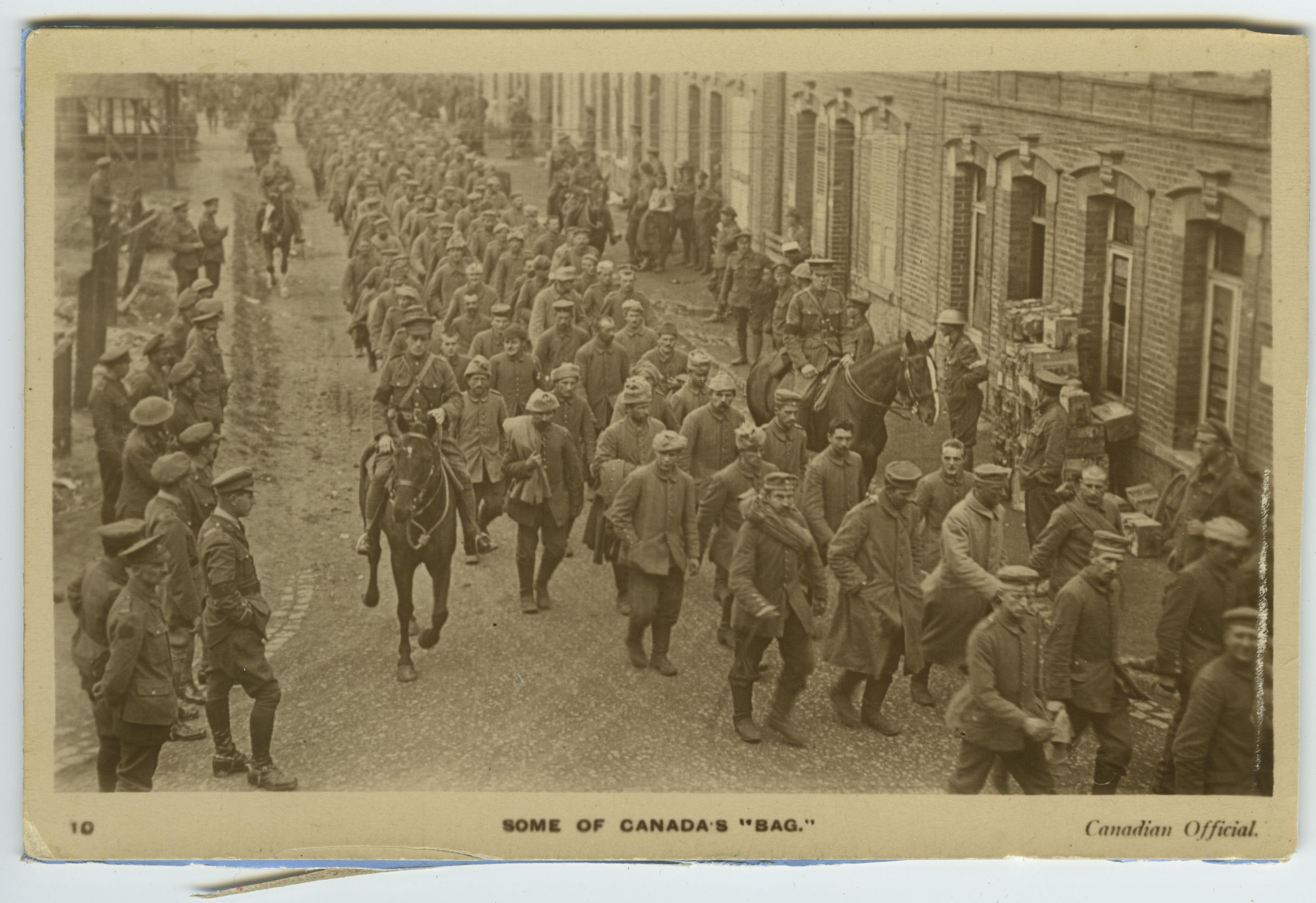 A large column of German prisoners of war are walking in the middle of a street. They are escorted by Canadian officers on horseback, while civilians and Canadian soldiers are watching from both sides of the street.Made/Created