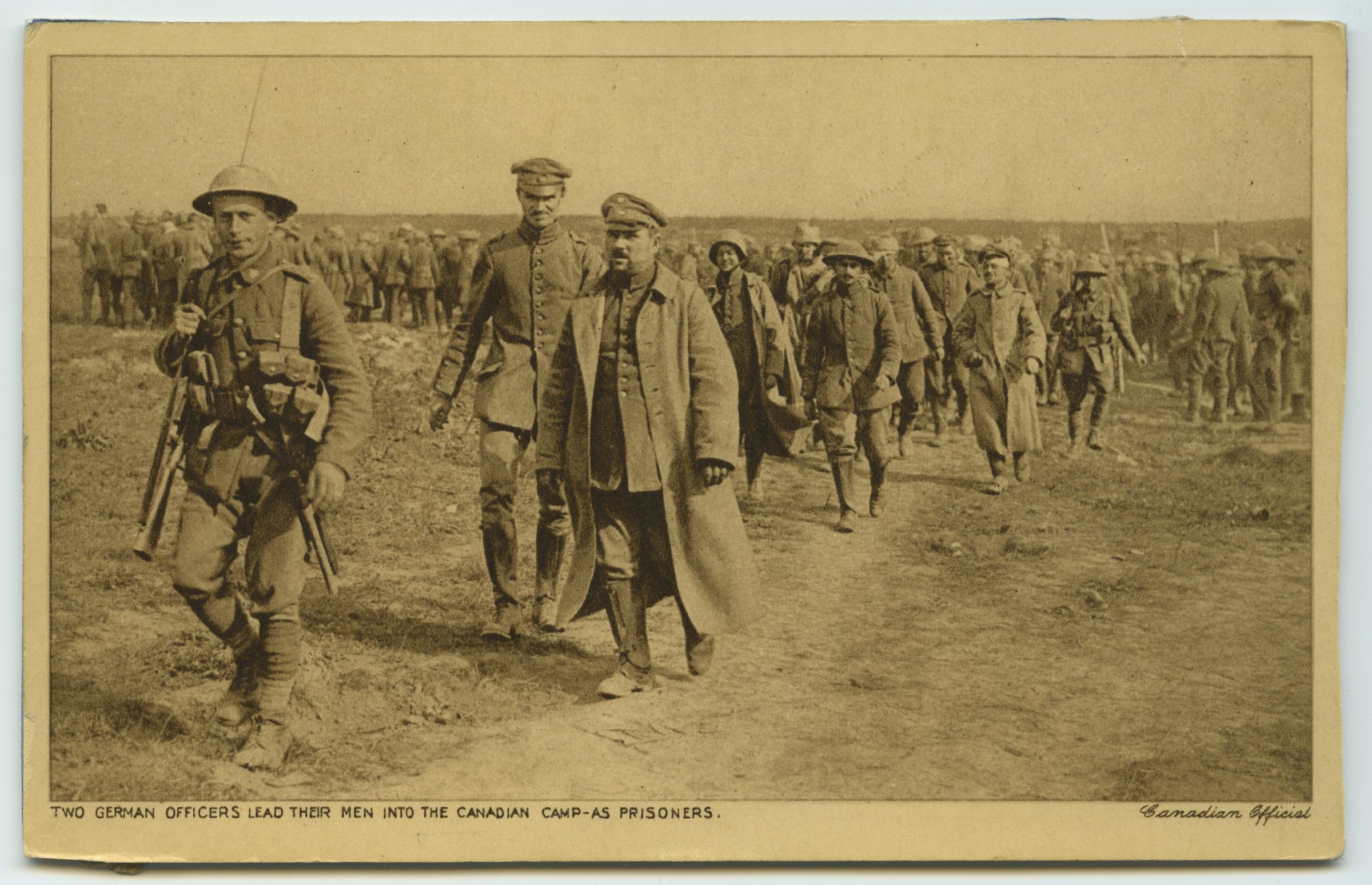 A Canadian soldier in foreground leading two German officers and behind them a group of German soldiers all being led into the Canadian camp as prisoners.Made/Created
