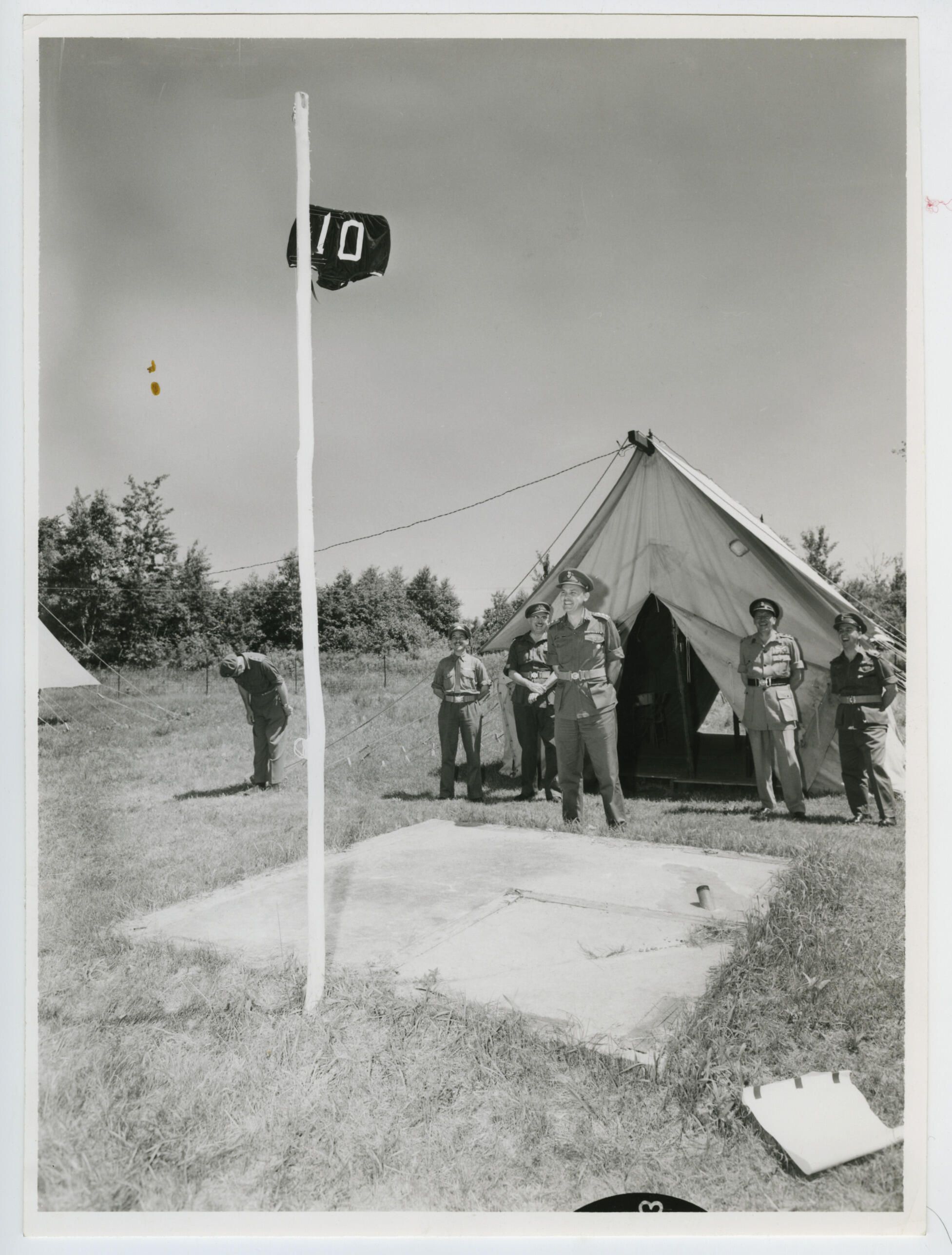 Officers and men standing outside their tents during training in the province of Quebec. They are looking at the flag pole to see that the flag was replaced by a pair of underwear with the number "10".Photograph Details