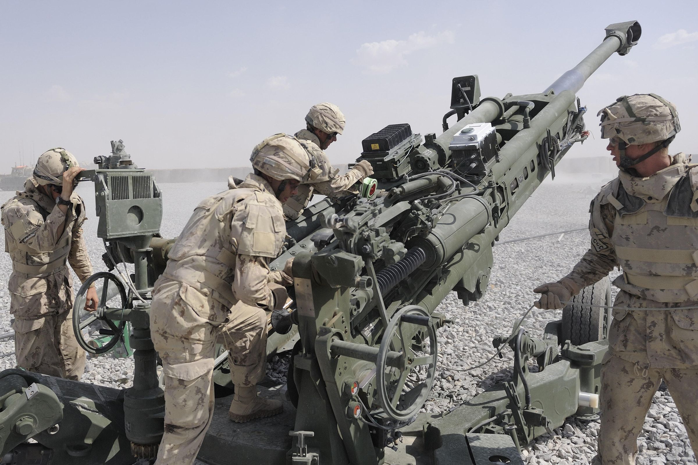 Members of the Royal Canadian Horse Artillery are preparing to fire an M777 155mm Howitzer.