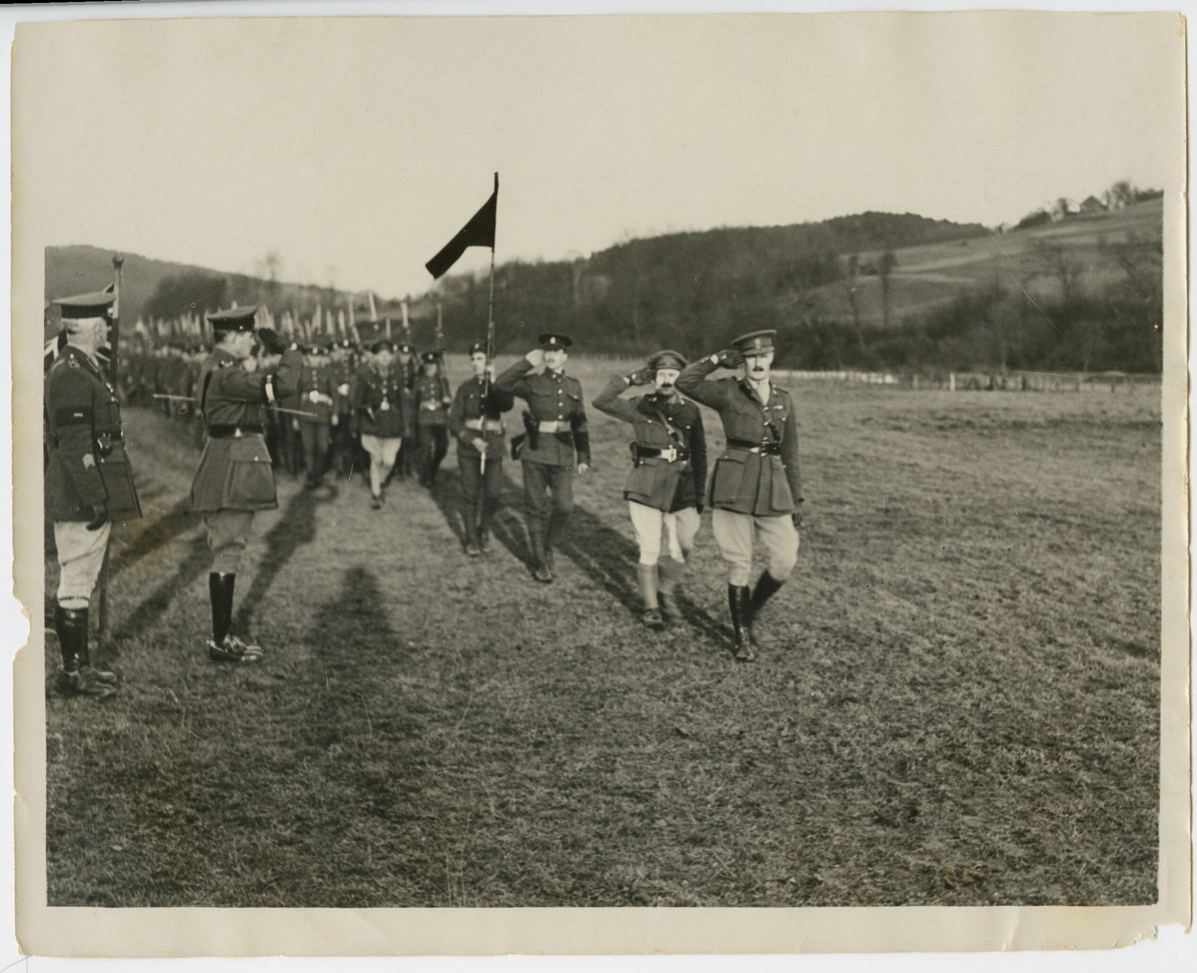 HRH Prince Arthur of Connaught taking the Salute after the RMR received their Colours from him. Behind HRH is Maj-Gen Sir A.C. Macdonnell (wearing light coloured riding britches). Leading the Regiment in its march past as they salute is Lt-Col Dick Worrall, followed by Capt. Donald MacRitchie, Adjt., then RSM Alfred Cummings and an NCO bearing the Regiment's Battle Flag carried on a lance. This Battle Flag consisted of the Regt's Patch in a white circle on a red field.