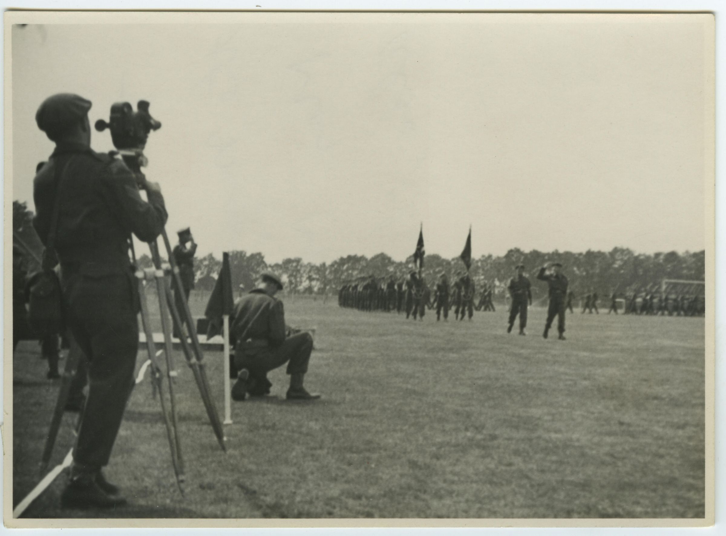A black and white photo shows the March Past. In the foreground, Major Matthew A. Willis is recording the event.Photograph Details
