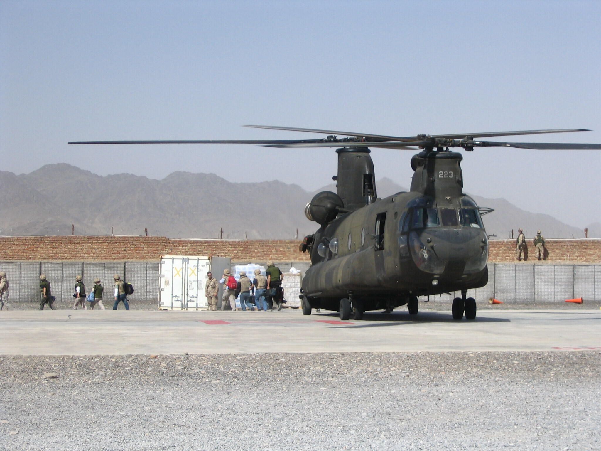 A Chinook Helicopter used to transport Stephen Harper, the Prime Minister of Canada, on a visit to Camp Nathan Smith. The Chinook Helicopter was used as a form of transportation to provide a secured transport for the Prime Minister and his team.