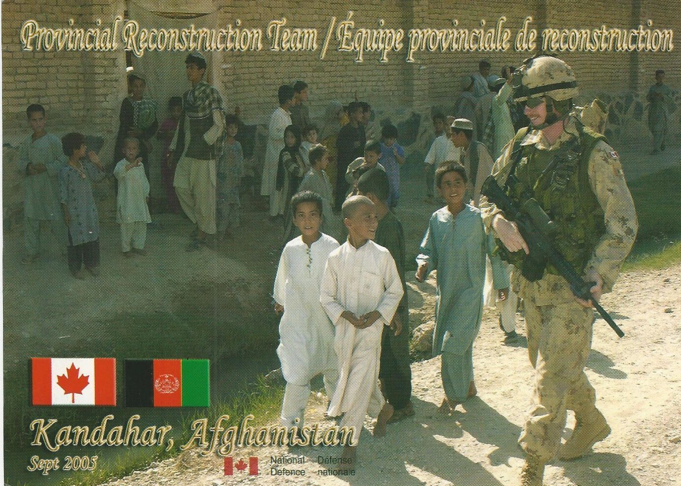 Postcard from the Provincial Reconstruction Team in Kandahar issued by the National Defence. The image shows a Canadian member of NATO/ISAF walking with a group of Afghan children in the street of a village.Relationships