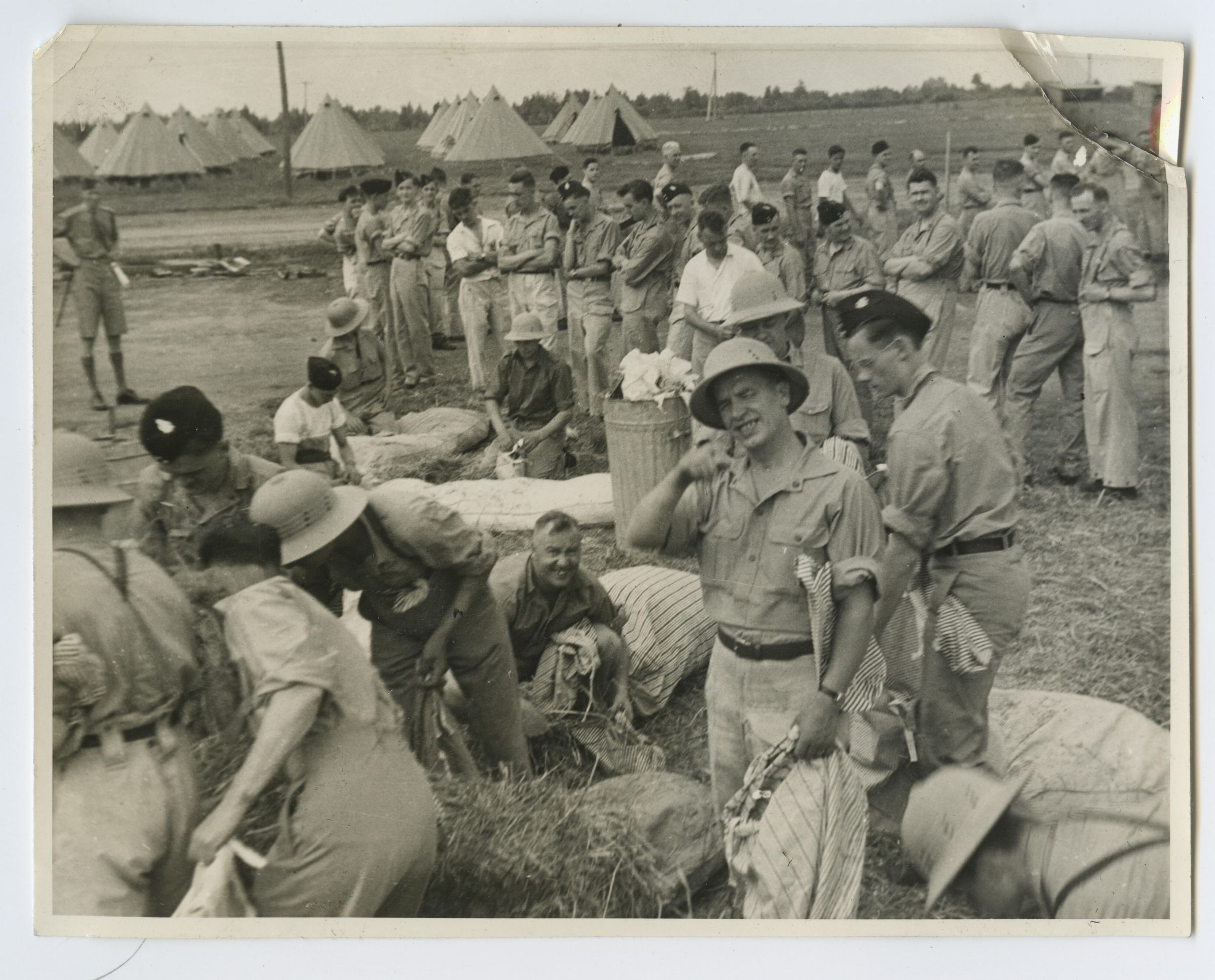 Members of The Royal Montreal Regiment are gathering up some straw to fill up their bedding pallets (also known as palliasses or tick) and their pillows. They are prepping the camp during training at Camp Farnham. Many soldiers are waiting their turn behind them, or they are waiting to receive other tasks.Photograph Details