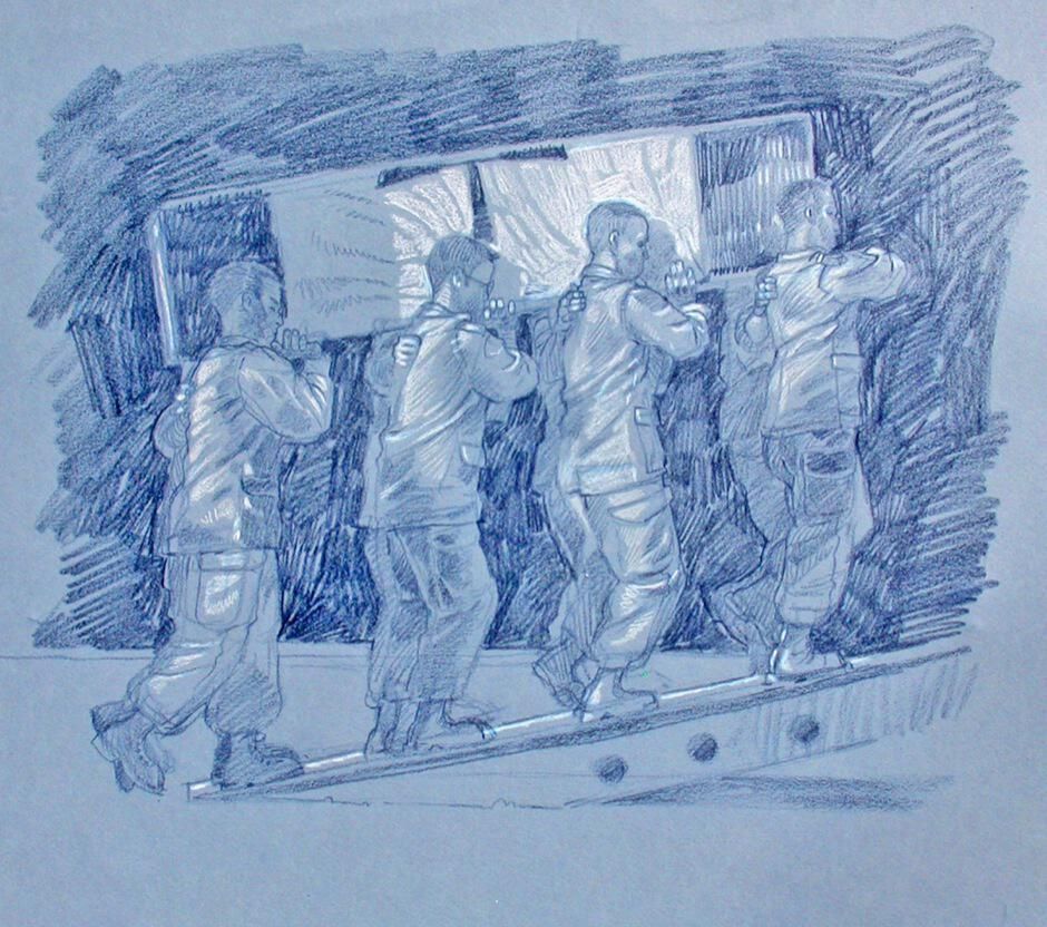 An artist's rendition of the Ramp Ceremony and the repatriation of a soldier killed in action.Artwork Details