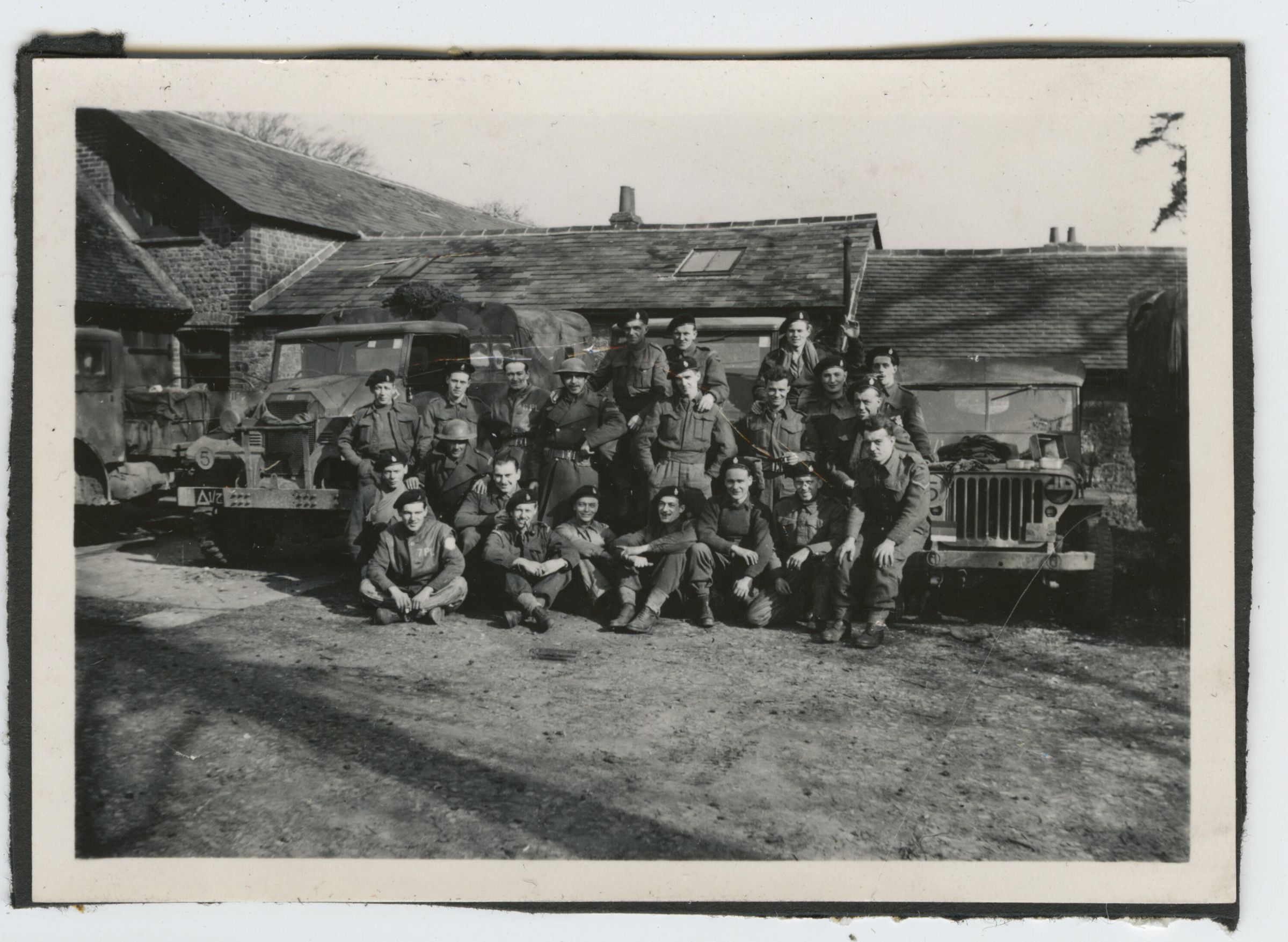 A black and white photo of Lieutenant Robert Schwob and his Reconnaissance section taking a rest at a country farm. There is an M38 Jeep and several Canadian Military Pattern trucks parked behind them.Photograph Details
