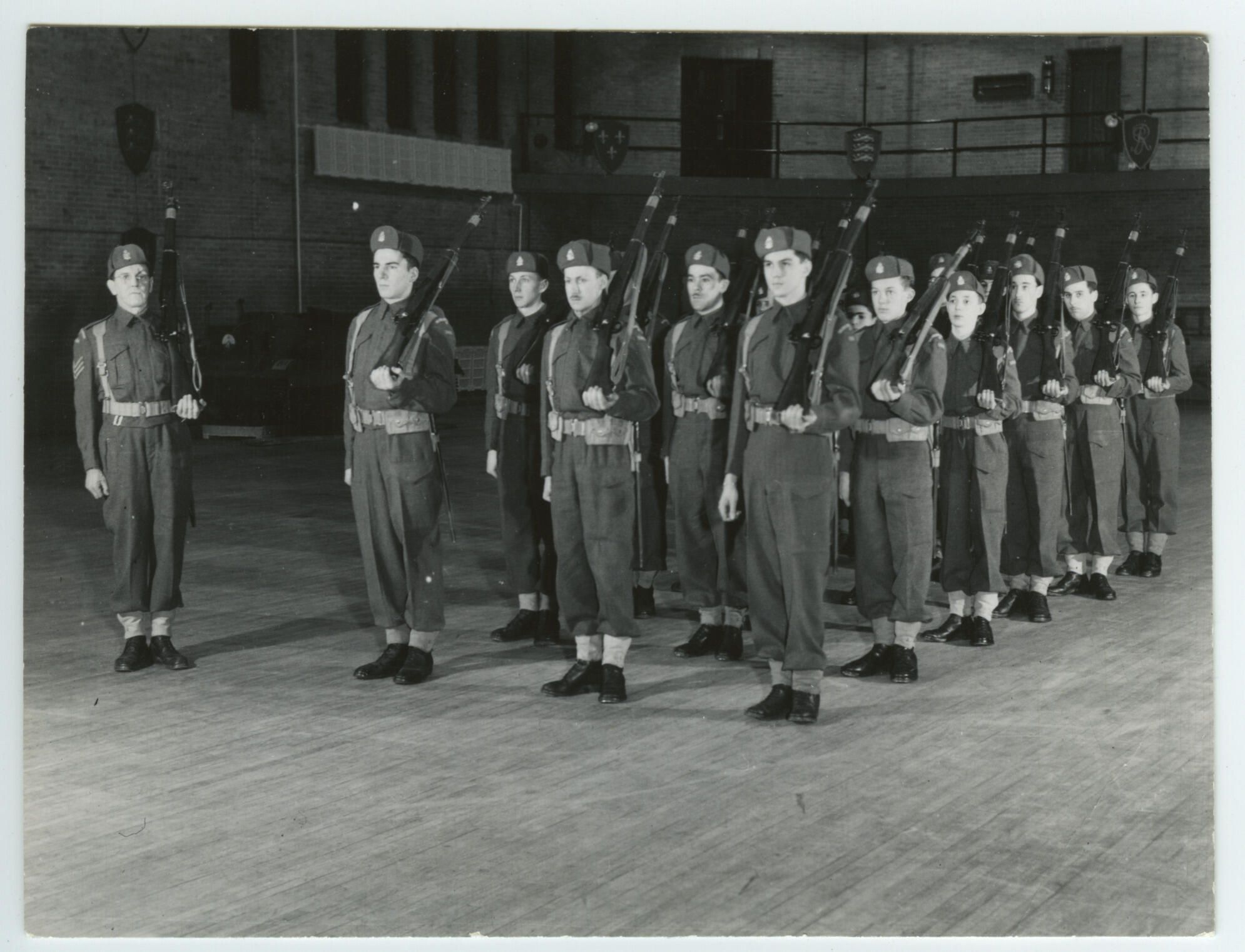 A group of recruits are standing on the parade square of the RMR Westmount Armoury with their rifles shouldered. They are wearing winter style cloth caps, sometimes referred to as 'Yukon' caps, and they are wearing WWII style canvas ankle gaiters. Their instructor, Sergeant Jack Green, is standing at the left.Photograph Details