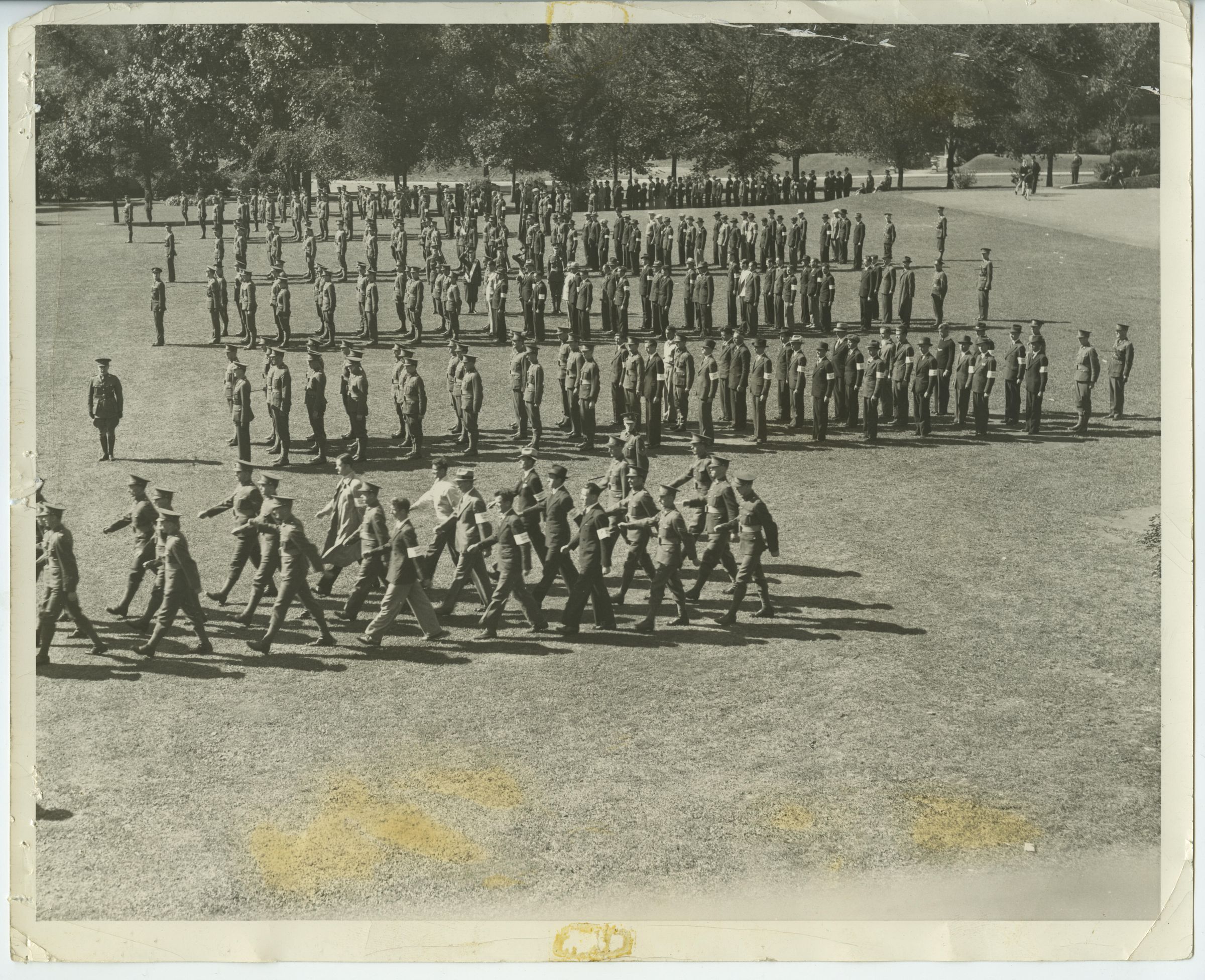 Recruits for the 1st Battalion, The Royal Montreal Regiment, formed up and marching off the field to the west of the Westmount Armoury. Many are still in civilian clothes while others are in uniform. Major J.H. McBride is standing in front of the second Company.Photograph Details