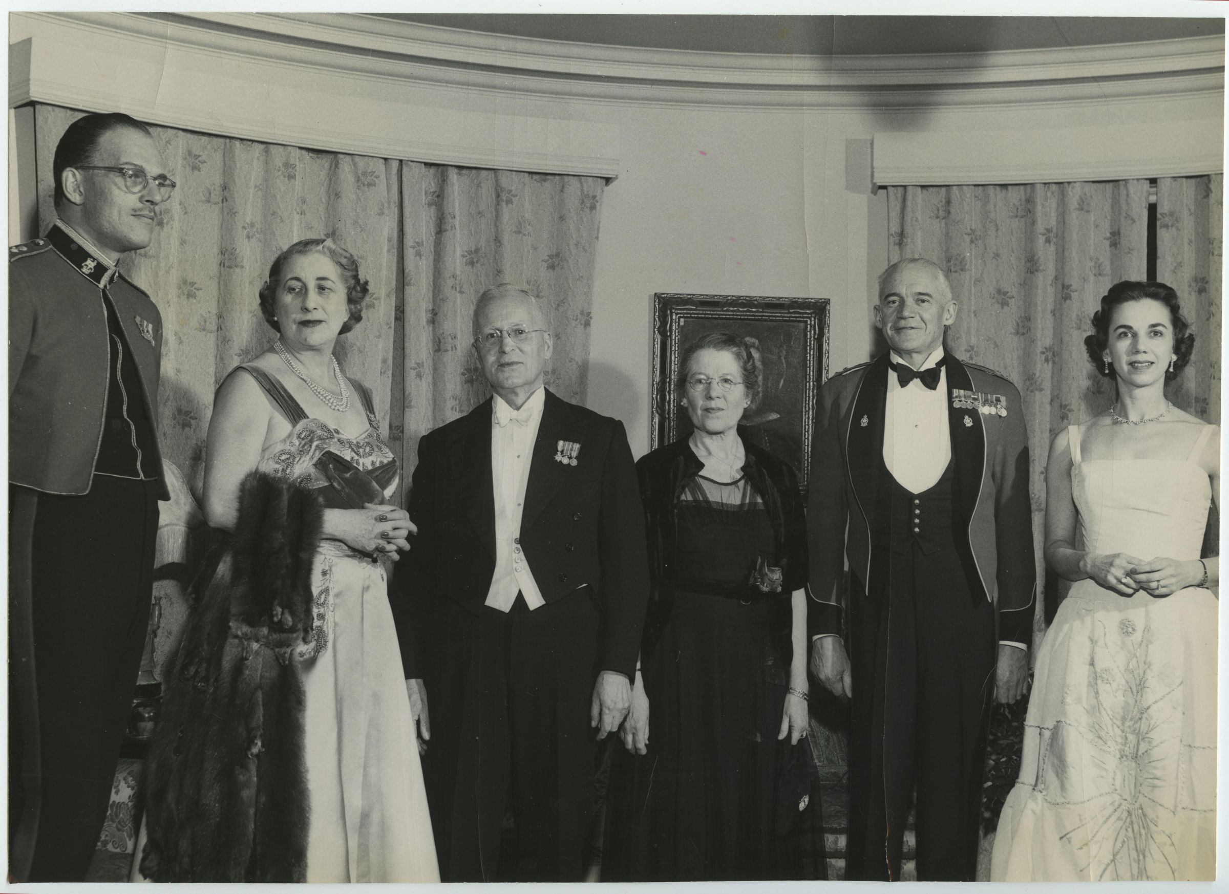Three couples are posing in their formal evening wear before an annual Regimental Officers Ball. Second from left is Mrs. Doris Whitehead; second from right is Brigadier-General G. Victor Whitehead.Photograph Details
