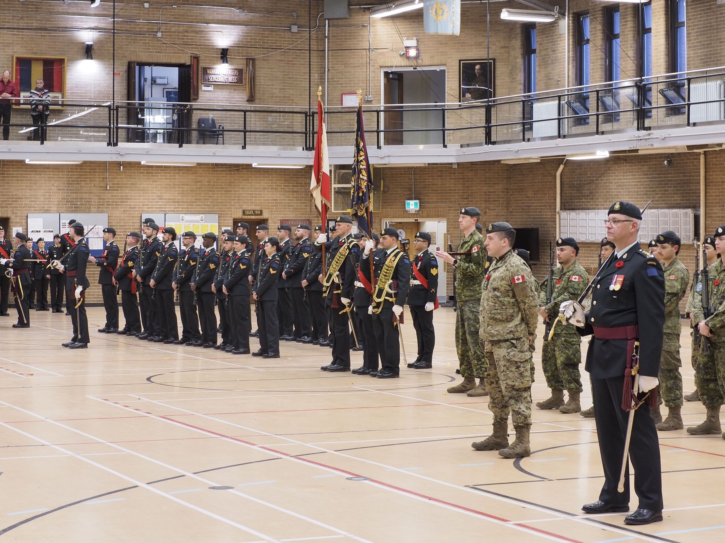 The RMR on parade in the Westmount Armoury for Remembrance Day on November 9, 2025. RSM Furholter stands in the front right. Some soldiers are wearing DEUs and others are wearing combats. The five soldier colour party are in the middle of the formation.