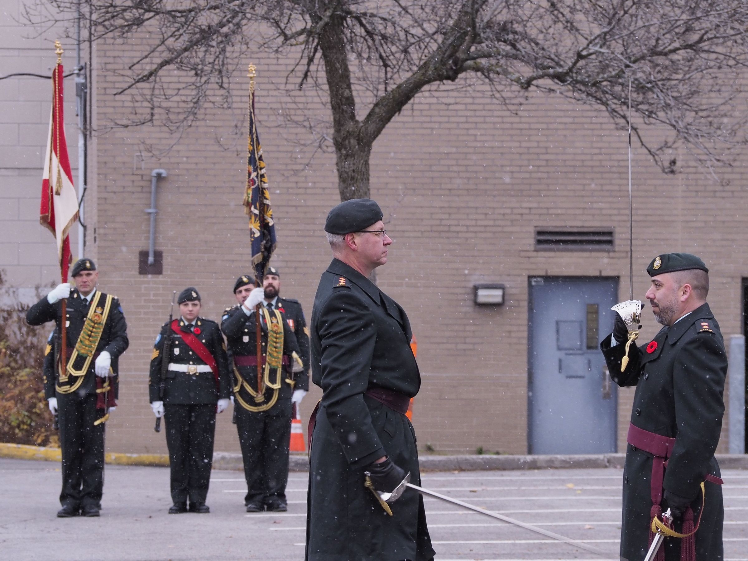 Photo taken during the Pointe-Claire Remembrance Day Parade in November 2025. In the back corner are the 5 soldiers from the colour party. In the front are RSM Furholter and CO Langlois.