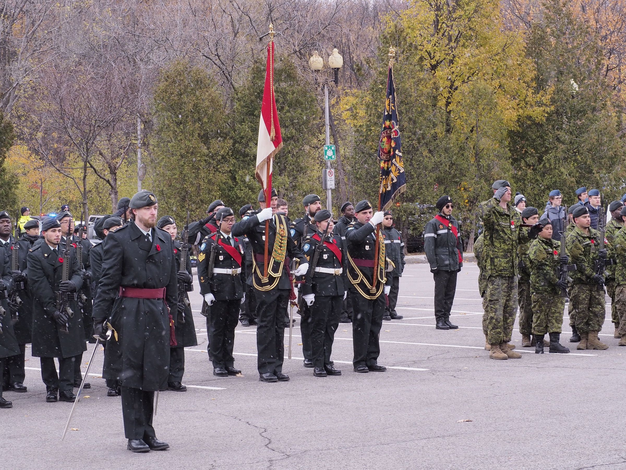 RMR's Remembrance Day Parade in Pointe Claire. The 5 person colour party stands in the centre, with various RMRs either in DEUs or combats. Their bayonets are fixed and some are saluting.
