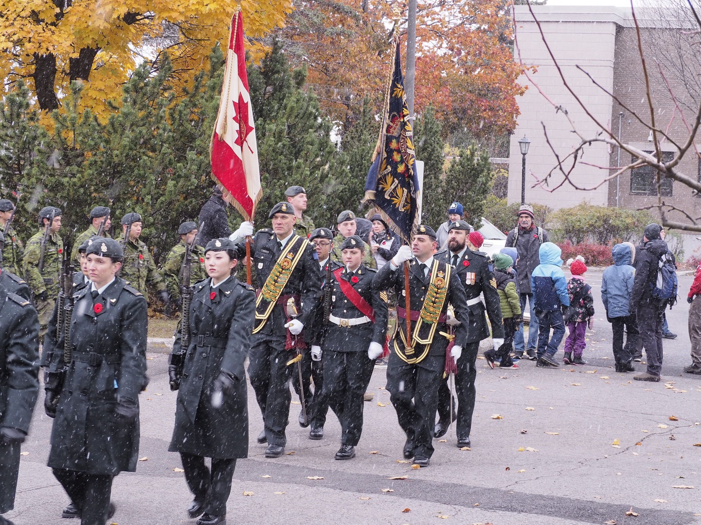 The RMR marches on parade in Pointe-Claire for the Remembrance Day parade on November 9, 2025. The colour party is in the middle with soldiers in combats marching behind them. Children and civilians are in the background watching. It is snowing while they march.