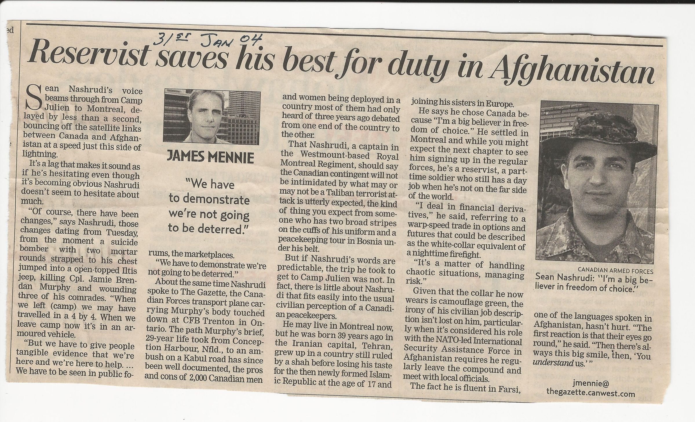 Newspaper clipping of an article from the Montreal Gazette written by James Mennie. This article is about an interview given by Captain Sean Nashrudi in Camp Julien in Afghanistan.Publication Details