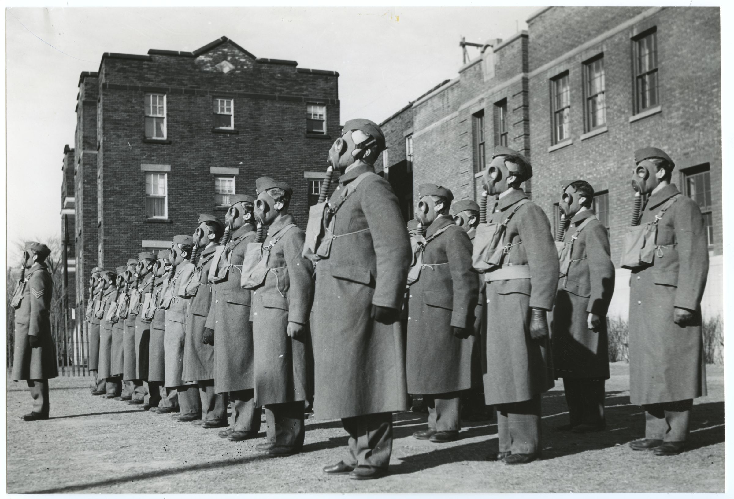 A black and white photo of a platoon of men training on the use of gas masks outside of the Westmount Armoury. In addition to their respirators, they are wearing wedge caps, winter great coats and gloves suggesting the photo was taken in late autumn.